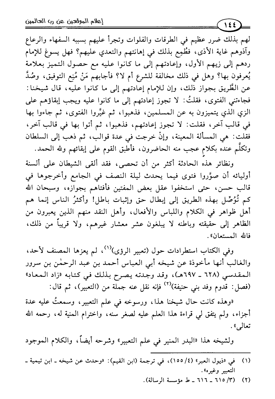 لهم بذلك ضرر عظيم في الطرقات والفلوات وتجرأ عليهم بسببه السفهاء والرعاع وآذوهم غاية الأذى، فطُمِع بذلك في إهانتهم والتعدي عليهم؟ فهل يسوغ للإمام ردهم إلى زيهم الأول، وإعادتهم إلى ما كانوا عليه مع حصول التميز بعلامة يُعرفون بها؟ وهل في ذلك مخالفة للشرع أم لا؟ فأجابهم مَنْ مُنِع التوفيق، وصُدَّ عن الطَّريق بجواز ذلك، وإن للإمام إعادتهم إلى ما كانوا عليه، قال شيخنا: فجاءتني الفتوى، فقلتُ: لا تجوز إعادتهم إلى ما كانوا عليه ويجب إبقاؤهم على الزي الذي يتميزون به عن المسلمين، فذهبوا، ثم غيَّروا الفتوى، ثم جاءوا بها في قالب آخر، فقلت: لا تجوز إعادتهم، فذهبوا، ثم أتوا بها في قالب آخر، فقلت: هي المسألة المعينة، وإنْ خرجت في عدة قوالب، ثم ذهب إلى السلطان وتكلَّم عنده بكلامٍ عجب منه الحاضرون، فأطبق القوم على إبقائهم وللَّه الحمد.