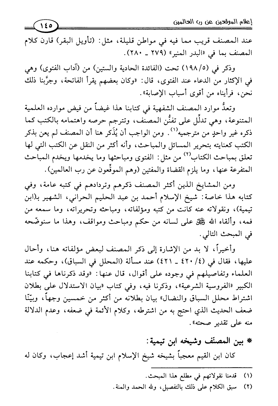 وتعدُّ موارد المصنف الشفهية في كتابنا هذا غيضًا من فيض موارده العلمية المتنوعة، وهي تدلل على تفنُّن المصنف، وتترجم حرصه واهتمامه بالكتب كما ذكره غير واحدٍ من مترجميه (١). ومن الواجب أن يُذَكر هنا أن المصنف لم يعن بذكر الكتب كعنايته بتحرير المسائل والمباحث، وأنه أكثر من النقل عن الكتب التي لها تعلق بمباحث الكتاب (٢) من مثل: الفتوى ومباحثها وما يخدمها ويخدم المباحث المتفرعة عنها، وما يلزم القضاة والمفتين (وهم الموقِّعون عن رب العالمين).