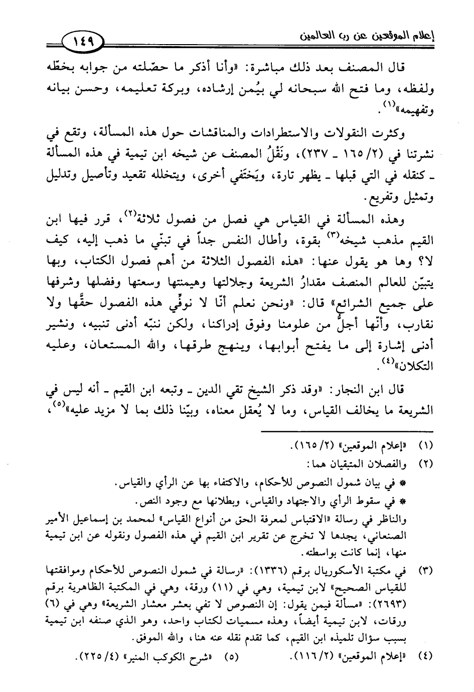 وهذه المسألة في القياس هي فصل من فصول ثلاثة (٢)، قرر فيها ابن القيم مذهب شيخه (٣) بقوة، وأطال النفس جدًّا في تبنّي ما ذهب إليه، كيف لا؟ وها هو يقول عنها: "هذه الفصول الثلاثة من أهم فصول الكتاب، وبها يتبيّن للعالم المنصف مقدارُ الشريعة وجلالتها وهيمنتها وسعتها وفضلها وشرفها على جميع الشرائع" قال: "ونحن نعلم أنّا لا نوفِّي هذه الفصول حقَّها ولا نقارب، وأنّها أجلُّ من علومنا وفوق إدراكنا، ولكن ننبّه أدنى تنبيه، ونشير أدنى إشارة إلى ما يفتح أبوابها، وينهج طرقها، واللَّه المستعان، وعليه التكلان" (٤).