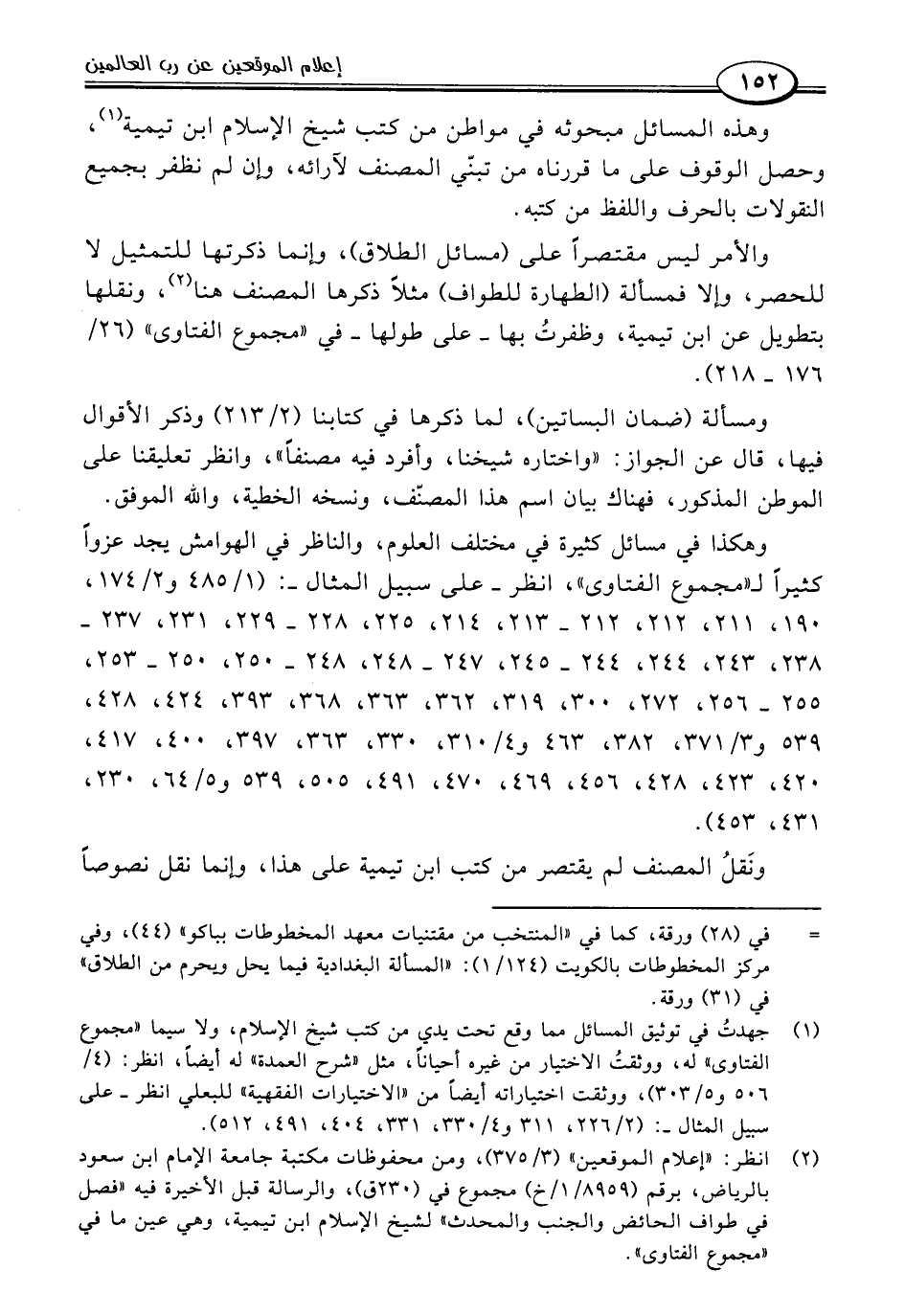 والأمر ليس مقتصرًا على (مسائل الطلاق)، وإنما ذكرتها للتمثيل لا للحصر، وإلا فمسألة (الطهارة للطواف) مثلًا ذكرها المصنف هنا (٢)، ونقلها بتطويل عن ابن تيمية، وظفرتُ بها -على طولها- في "مجموع الفتاوى" (٢٦/ ١٧٦ - ٢١٨).