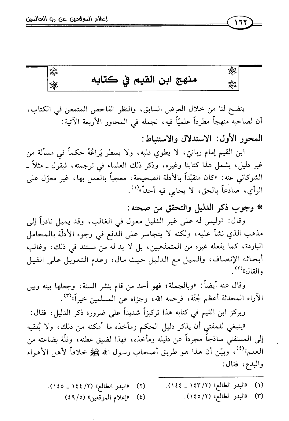 ابن القيم إمام ربانيّ، لا يطوي قلبه، ولا يسطر يَراعُهُ حكمًا في مسألة من غير دليل، يشمل هذا كتابنا وغيره، وذكر ذلك العلماء في ترجمته، فيقول -مثلًا- الشوكاني عنه: "كان متقيّدًا بالأدلة الصحيحة، معجبًا بالعمل بها، غير معوّل على الرأي، صادعًا بالحق، لا يحابي فيه أحدًا" (١).