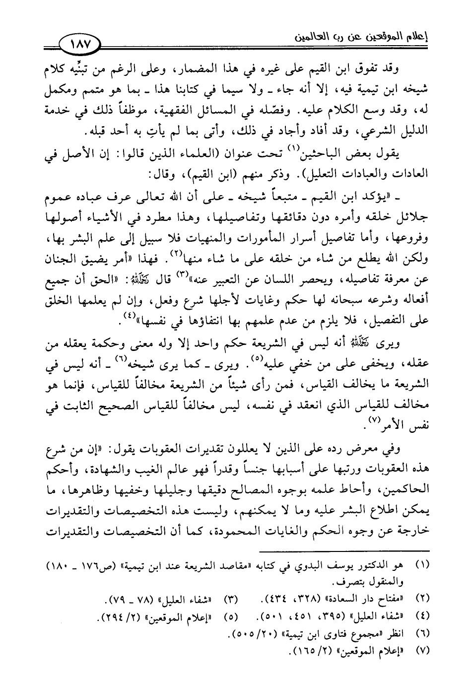 يقول بعض الباحثين (١) تحت عنوان (العلماء الذين قالوا: إن الأصل في العادات والعبادات التعليل). وذكر منهم (ابن القيم)، وقال: