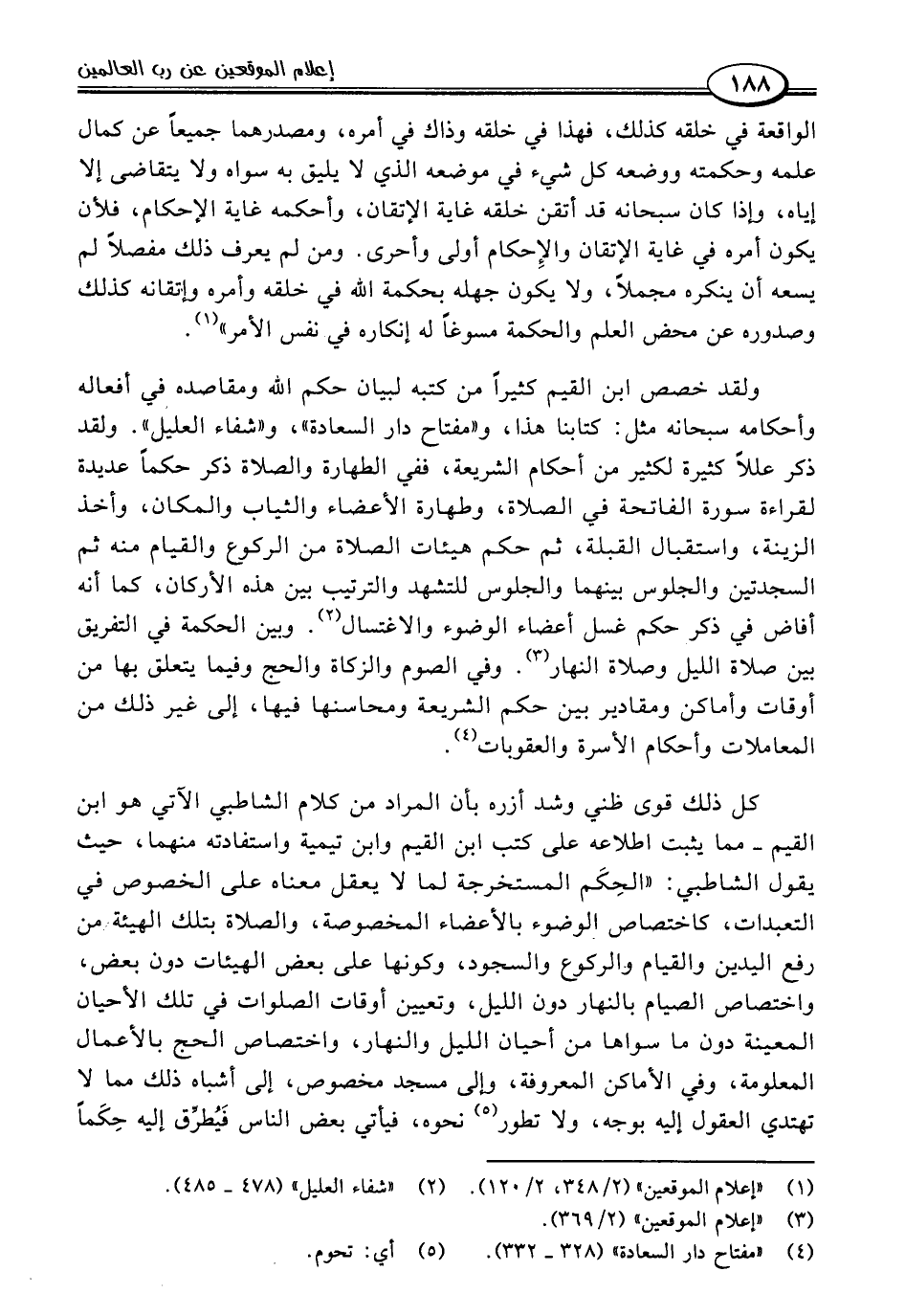 كل ذلك قوى ظني وشد أزره بأن المراد من كلام الشاطبي الآتي هو ابن القيم -مما يثبت اطلاعه على كتب ابن القيم وابن تيمية واستفادته منهما، حيث يقول الشاطبي: "الحِكَم المستخرجة لما لا يعقل معناه على الخصوص في التعبدات، كاختصاص الوضوء بالأعضاء المخصوصة، والصلاة بتلك الهيئة من رفع اليدين والقيام والركوع والسجود، وكونها على بعض الهيئات دون بعض، واختصاص الصيام بالنهار دون الليل، وتعيين أوقات الصلوات في تلك الأحيان المعينة دون ما سواها من أحيان الليل والنهار، واختصاص الحج بالأعمال المعلومة، وفي الأماكن المعروفة، وإلى مسجد مخصوص، إلى أشباه ذلك مما لا تهتدي العقول إليه بوجه، ولا تطور (٥) نحوه، فيأتي بعض الناس فَيُطرِّق إليه حِكَمًا