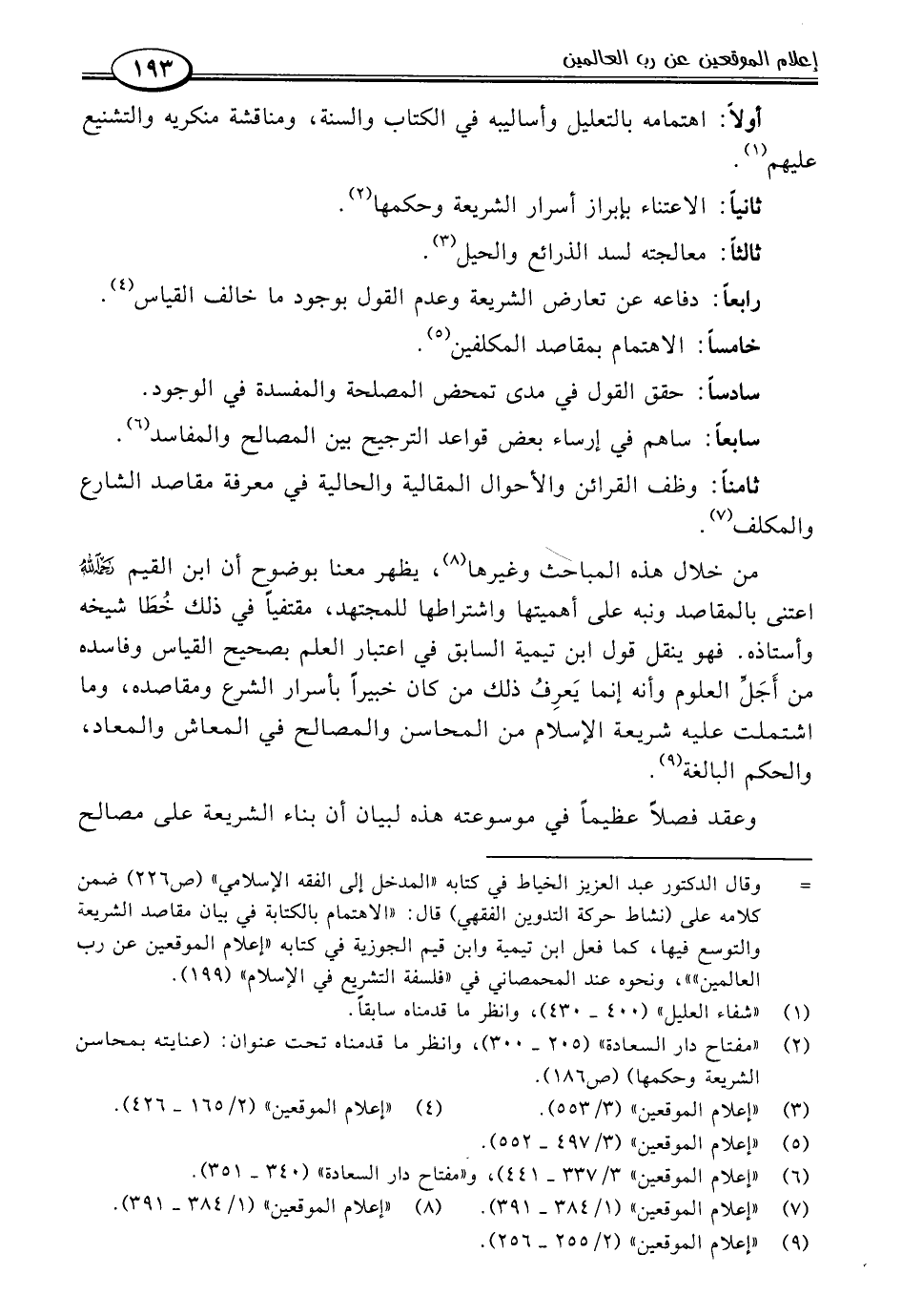 = وقال الدكتور عبد العزيز الخياط في كتابه "المدخل إلى الفقه الإسلامي" (ص ٢٢٦) ضمن كلامه على (نشاط حركة التدوين الفقهي) قال: "الاهتمام بالكتابة في بيان مقاصد الشريعة والتوسع فيها، كما فعل ابن تيمية وابن قيم الجوزية في كتابه "إعلام الموقعين عن رب العالمين""، ونحوه عند المحمصاني في "فلسفة التشريع في الإسلام" (١٩٩).