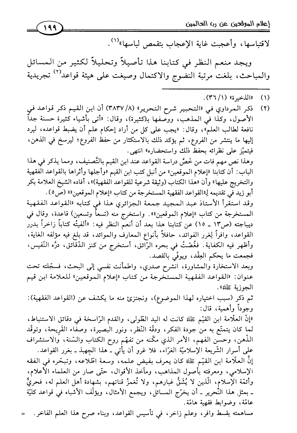 وهذا نص مهم فات من خَصَّ دراسة القواعد عند ابن القيم بالتَّصنيف، ومما يذكر في هذا الباب: أن كتابنا "إعلام الموقعين" من أنبل كتب ابن القيم "وأجلها وأثراها بالقواعد الفقهية والتخريج عليها" وأن "هذا الكتاب (وثيقة شرعية للقواعد الفقهية) "، أفاده الشيخ العلامة بكر أبو زيد في تقديمه لـ"القواعد الفقهية المستخرجة من كتاب "إعلام الموقعين"" (ص ٥).