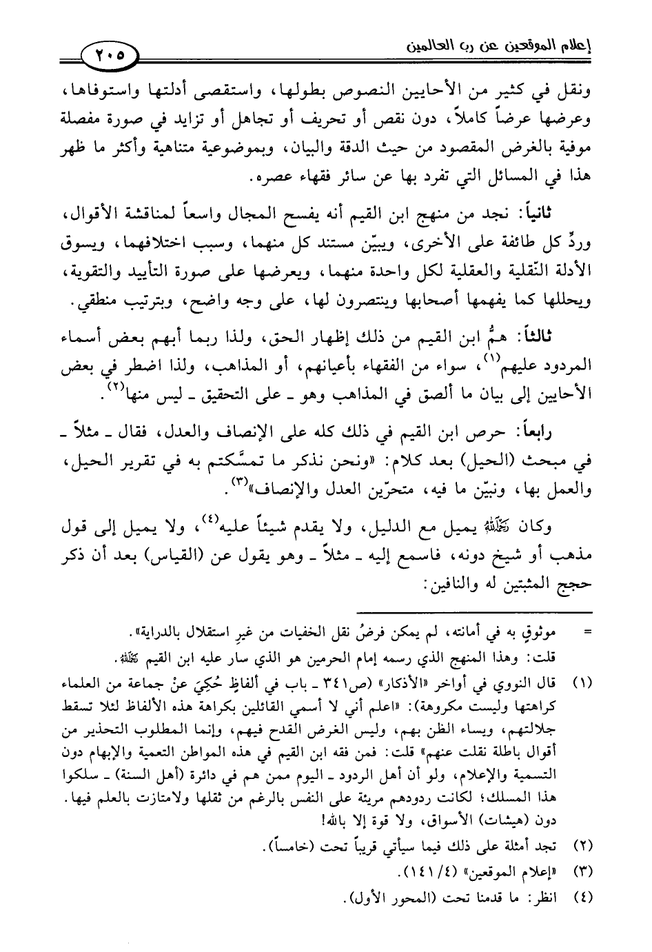 رابعًا: حرص ابن القيم في ذلك كله على الإنصاف والعدل، فقال -مثلًا- في مبحث (الحيل) بعد كلام: "ونحن نذكر ما تمسَّكتم به في تقرير الحيل، والعمل بها، ونبيّن ما فيه، متحرّين العدل والإنصاف" (٣).