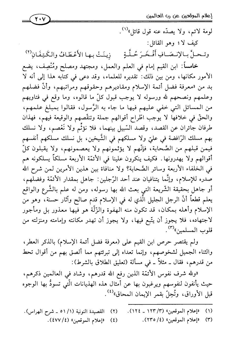 خامسًا: ابن القيم إمام في العلم والعمل، ومجتهد ومصلح ومُنْصِف، يضع الأمور مكانها، ومن بين ذلك: تقديره للعلماء، وقد دعى في كتابه هذا إلى أنه لا بد من "معرفة فضل أئمة الإسلام ومقاديرهم وحقوقهم ومراتبهم، وأنّ فضلهم وعلمهم ونصحهم للَّه ورسوله لا يوجب قبول كلّ ما قالوه، وما وقع في فتاويهم من المسائل التي خفي عليهم فيها ما جاء به الرَّسول، فقالوا بمبلغ علمهم، والحقّ في خلافها لا يوجب اطّراح أقوالهم جملة وتنقّصهم والوقيعة فيهم، فهذان طرفان جائران عن القصد، وقصد السّبيل بينهما، فلا نؤثِّم ولا نَعْصم، ولا نسلك بهم مسلك الرّافضة في عليّ ولا مسلكهم في الشَّيخين، بل نسلك مسلكهم أنفسهم فيمن قبلهم من الصَّحابة، فإنّهم لا يؤثمونهم ولا يعصمونهم، ولا يقبلون كلّ أقوالهم ولا يهدرونها. فكيف ينكرون علينا في الأئمّة الأربعة مسلكًا يسلكونه هم في الخلفاء الأربعة وسائر الصَّحابة؟ ولا منافاة بين هذين الأمرين لمن شرح اللَّه صدره للإسلام، وإنَّما يتنافيان عند أحد الرّجلين: جاهل بمقدار الأئمّة وفضلهم، أو جاهل بحقيقة الشّريعة التي بعث اللَّه بها رسوله، ومن له علم بالشَّرع والواقع يعلم قطعًا أنّ الرجل الجليل الَّذي له في الإسلام قدم صالح وآثار حسنة، وهو من الإسلام وأهله بمكان، قد تكون منه الهفوة والزّلّة هو فيها معذور بل ومأجور لاجتهاده، فلا يجوز أن يتّبع فيها، ولا يجوز أن تهدر مكانته وإمامته ومنزلته من قلوب المسلمين" (٣).