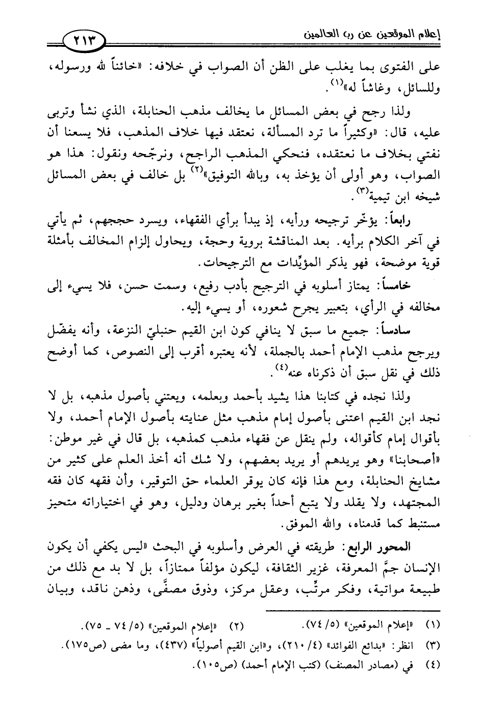 ولذا نجده في كتابنا هذا يشيد بأحمد وبعلمه، ويعتني بأصول مذهبه، بل لا نجد ابن القيم اعتنى بأصول إمام مذهب مثل عنايته بأصول الإمام أحمد، ولا بأقوال إمام كأقواله، ولم ينقل عن فقهاء مذهب كمذهبه، بل قال في غير موطن: "أصحابنا" وهو يريدهم أو يريد بعضهم، ولا شك أنه أخذ العلم على كثير من مشايخ الحنابلة، ومع هذا فإنه كان يوقر العلماء حق التوقير، وأن فقهه كان فقه المجتهد، ولا يقلد ولا يتبع أحدًا بغير برهان ودليل، وهو في اختياراته متحيز مستنبط كما قدمناه، واللَّه الموفق.