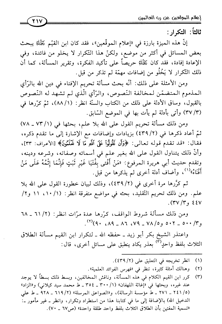 واعتذر الشيخ بكر أبو زيد -حفظه اللَّه- لتكرار ابن القيم مسألة الطلاق الثلاث بلفظ واحدٍ (٣) بعذر يكاد ينطبق على مسائل أخرى، قال: