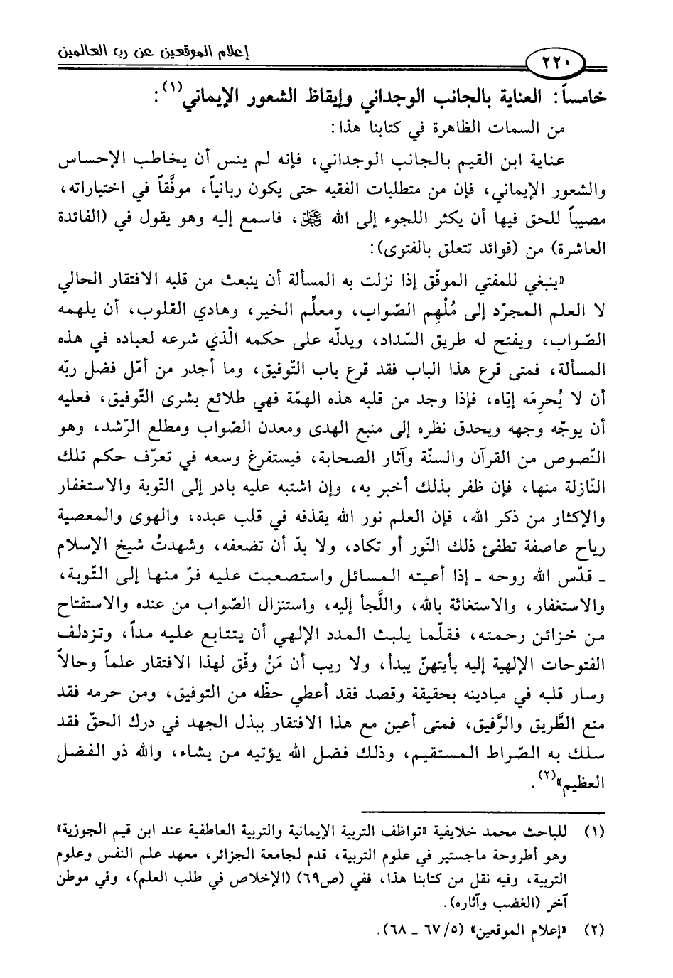 عناية ابن القيم بالجانب الوجداني، فإنه لم ينس أن يخاطب الإحساس والشعور الإيماني، فإن من متطلبات الفقيه حتى يكون ربانيًا، موفَّقًا في اختياراته، مصيبًا للحق فيها أن يكثر اللجوء إلى اللَّه عز وجل، فاسمع إليه وهو يقول في (الفائدة العاشرة) من (فوائد تتعلق بالفتوى):