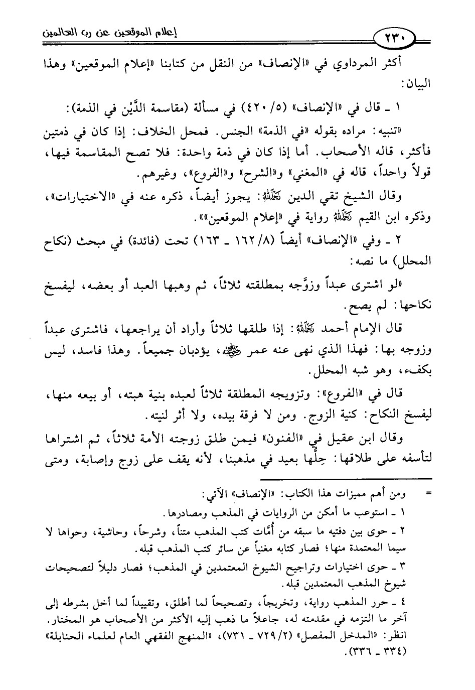 أكثر المرداوي في "الإنصاف" من النقل من كتابنا "إعلام الموقعين" وهذا البيان: