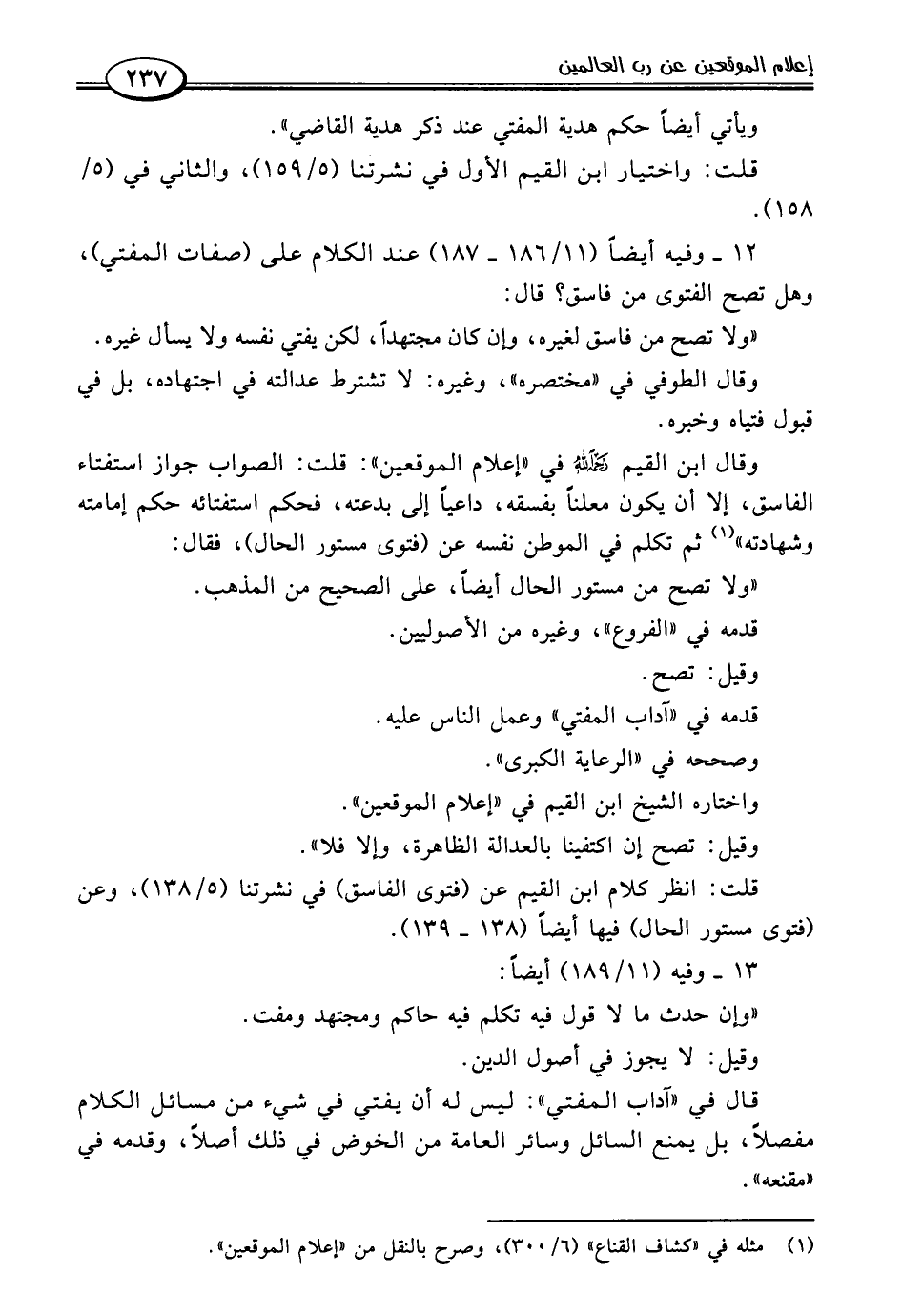 قلت: انظر كلام ابن القيم عن (فتوى الفاسق) في نشرتنا (٥/ ١٣٨)، وعن (فتوى مستور الحال) فيها أيضًا (١٣٨ - ١٣٩).