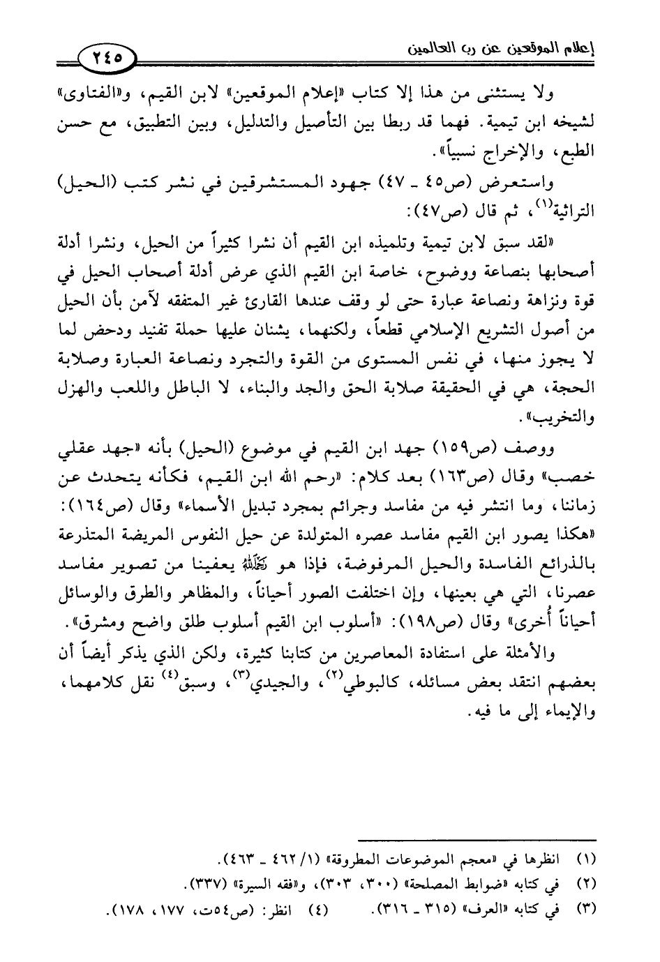 ولا يستثنى من هذا إلا كتاب "إعلام الموقعين" لابن القيم، و"الفتاوى" لشيخه ابن تيمية. فهما قد ربطا بين التأصيل والتدليل، وبين التطبيق، مع حسن الطبع، والإخراج نسبيًا".