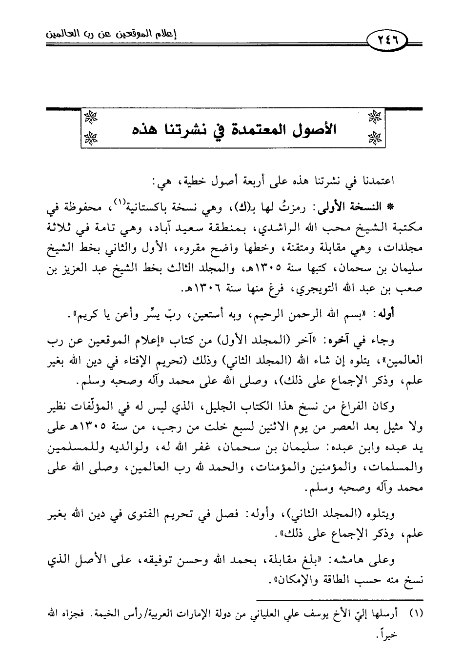 وجاء في آخره: "آخر (المجلد الأول) من كتاب "إعلام الموقعين عن رب العالمين"، يتلوه إن شاء اللَّه (المجلد الثاني) وذلك (تحريم الإفتاء في دين اللَّه بغير علم، وذكر الإجماع على ذلك)، وصلى اللَّه على محمد وآله وصحبه وسلم.