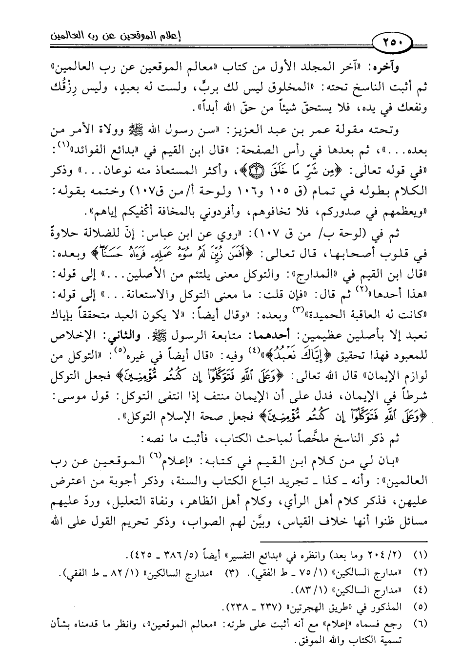 ثم في (لوحة ب/ من ق ١٠٧): "روي عن ابن عباس: إنّ للضلالة حلاوةً في قلوب أصحابها، قال تعالى: {أَفَمَنْ زُيِّنَ لَهُ سُوءُ عَمَلِهِ فَرَآهُ حَسَنًا} وبعده: "قال ابن القيم في "المدارج": والتوكل معنى يلتئم من الأصلين. . . " إلى قوله: "هذا أحدها" (٢) ثم قال: "فإن قلتْ ما معنى التوكل والاستعانة. . . " إلى قوله: "كانت له العاقبة الحميدة" (٣) وبعده: "وقال أيضًا: "لا يكون العبد متحققًا بإياك نعبد إلا بأصلين عظيمين: أحدهما: متابعة الرسول -صلى اللَّه عليه وسلم-. والثاني: الإخلاص للمعبود فهذا تحقيق {إِيَّاكَ نَعْبُدُ} " (٤) وفيه: "قال أيضًا في غيره (٥): "التوكل من لوازم الإيمان" قال اللَّه تعالى: {وَعَلَى اللَّهِ فَتَوَكَّلُوا إِنْ كُنْتُمْ مُؤْمِنِينَ} فجعل التوكل شرطًا في الإيمان، فدل على أن الإيمان منتف إذا انتفى التوكل: قول موسى: {وَعَلَى اللَّهِ فَتَوَكَّلُوا إِنْ كُنْتُمْ مُؤْمِنِينَ} فجعل صحة الإسلام التوكل".