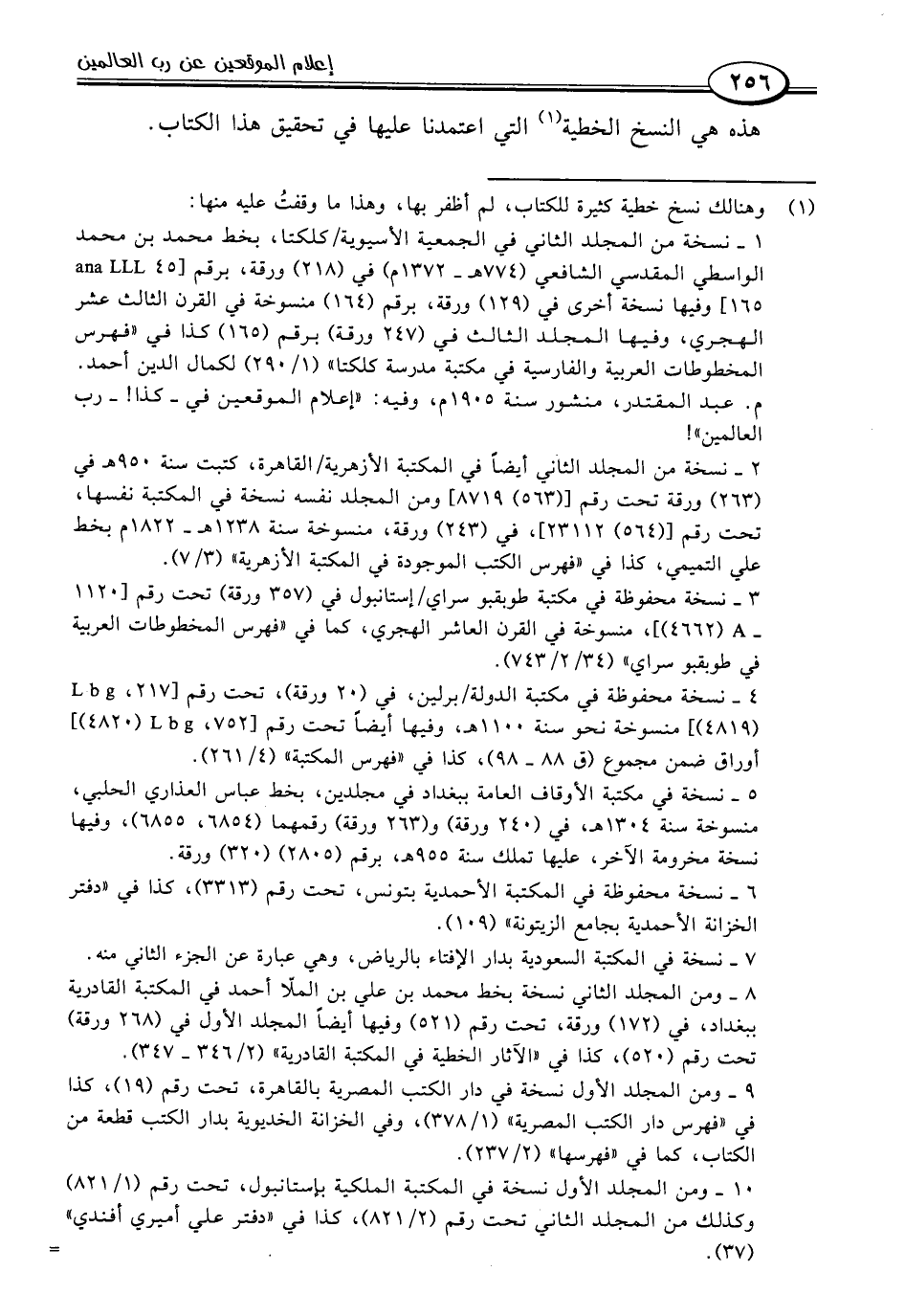 ١ - نسخة من المجلد الثاني في الجمعية الأسيوية/ كلكتا، بخط محمد بن محمد الواسطي المقدسي الشافعي (٧٧٤ هـ - ١٣٧٢ م) في (٢١٨) ورقة، برقم [٤٥ ana LLL ١٦٥] وفيها نسخة أخرى في (١٢٩) ورقة، برقم (١٦٤) منسوخة في القرن الثالث عشر الهجري، وفيها المجلد الثالث في (٢٤٧ ورقة) برقم (١٦٥) كذا في "فهرس المخطوطات العربية والفارسية في مكتبة مدرسة كلكتا" (١/ ٢٩٠) لكمال الدين أحمد. م. عبد المقتدر، منشور سنة ١٩٠٥ م، وفيه: "إعلام الموقعين في -كذا! - رب العالمين"!