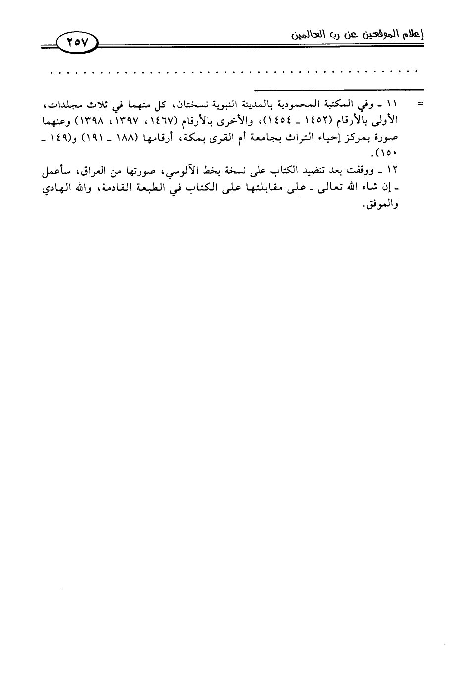 ١٢ - ووقفت بعد تنضيد الكتاب على نسخة بخط الآلوسي، صورتها من العراق، سأعمل -إن شاء اللَّه تعالى- على مقابلتها على الكتاب في الطبعة القادمة، واللَّه الهادي والموفق.