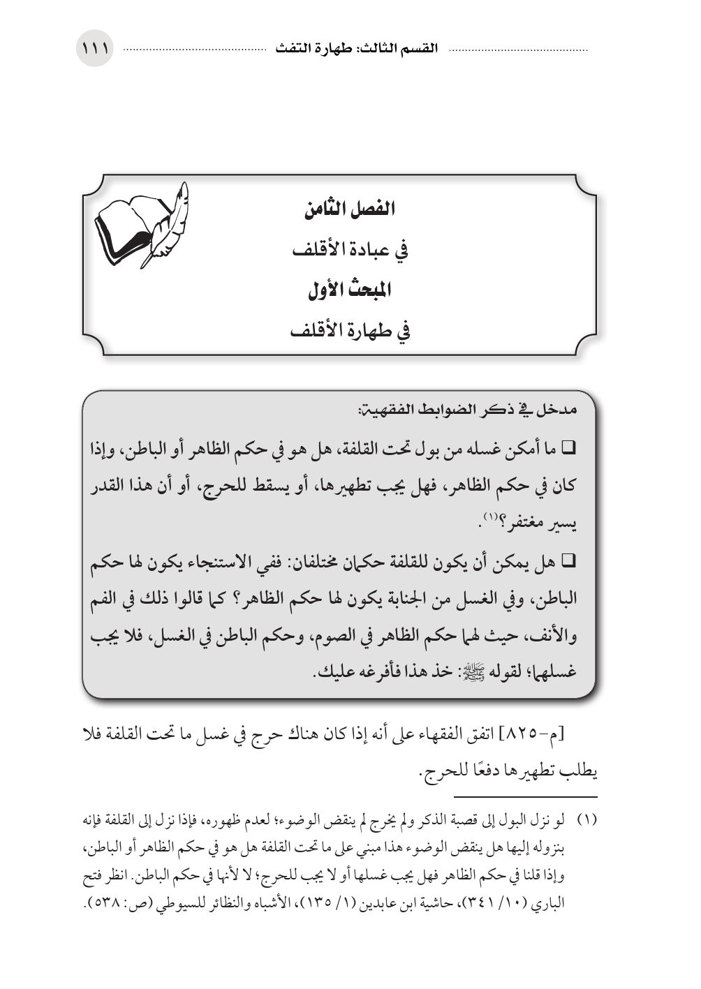 (¬١) لو نزل البول إلى قصبة الذكر ولم يخرج لم ينقض الوضوء؛ لعدم ظهوره، فإذا نزل إلى القلفة فإنه بنزوله إليها هل ينقض الوضوء هذا مبني على ما تحت القلفة هل هو في حكم الظاهر أو الباطن، وإذا قلنا في حكم الظاهر فهل يجب غسلها أو لا يجب للحرج؛ لا لأنها في حكم الباطن. انظر فتح الباري (١٠/ ٣٤١)، حاشية ابن عابدين (١/ ١٣٥)، الأشباه والنظائر للسيوطي (ص: ٥٣٨).