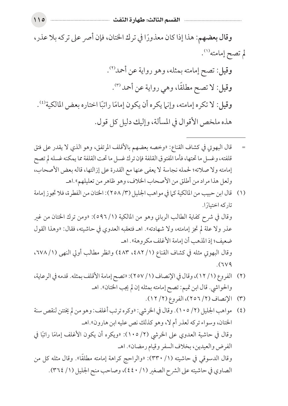 (¬٢) الفروع (١/ ١٢)، وقال في الإنصاف (١/ ٢٥٧): «تصح إمامة الأقلف بمثله. قدمه في الرعاية، والحواشي. قال ابن تميم: تصح إمامته بمثله إن لم يجب الختان». اهـ