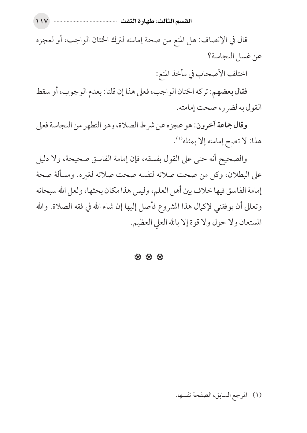 قال في الإنصاف: هل المنع من صحة إمامته لترك الختان الواجب، أو لعجزه عن غسل النجاسة؟