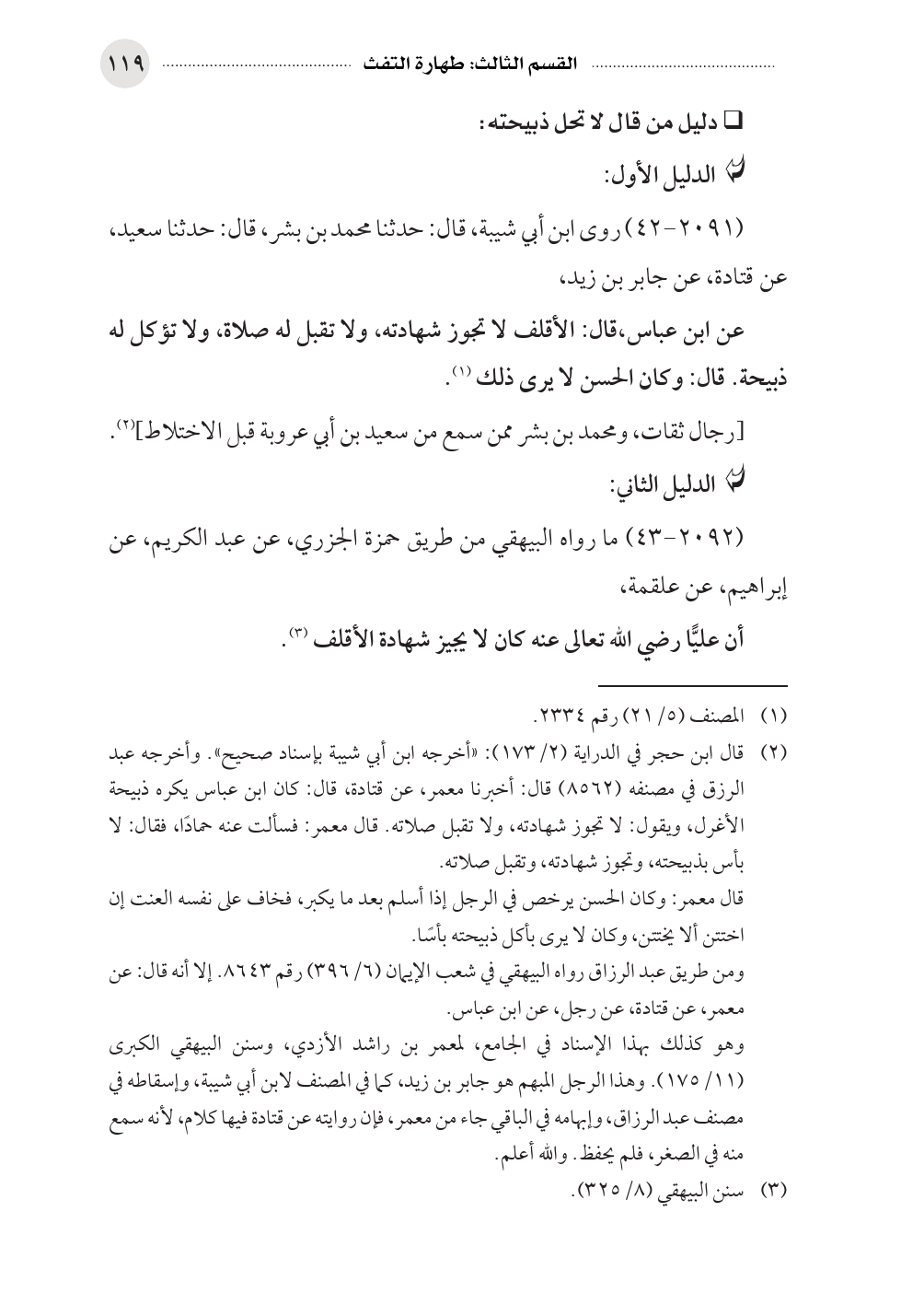 (¬٢) قال ابن حجر في الدراية (٢/ ١٧٣): «أخرجه ابن أبي شيبة بإسناد صحيح». وأخرجه عبد الرزق في مصنفه (٨٥٦٢) قال: أخبرنا معمر، عن قتادة، قال: كان ابن عباس يكره ذبيحة الأغرل، ويقول: لا تجوز شهادته، ولا تقبل صلاته. قال معمر: فسألت عنه حمادًا، فقال: لا بأس بذبيحته، وتجوز شهادته، وتقبل صلاته.