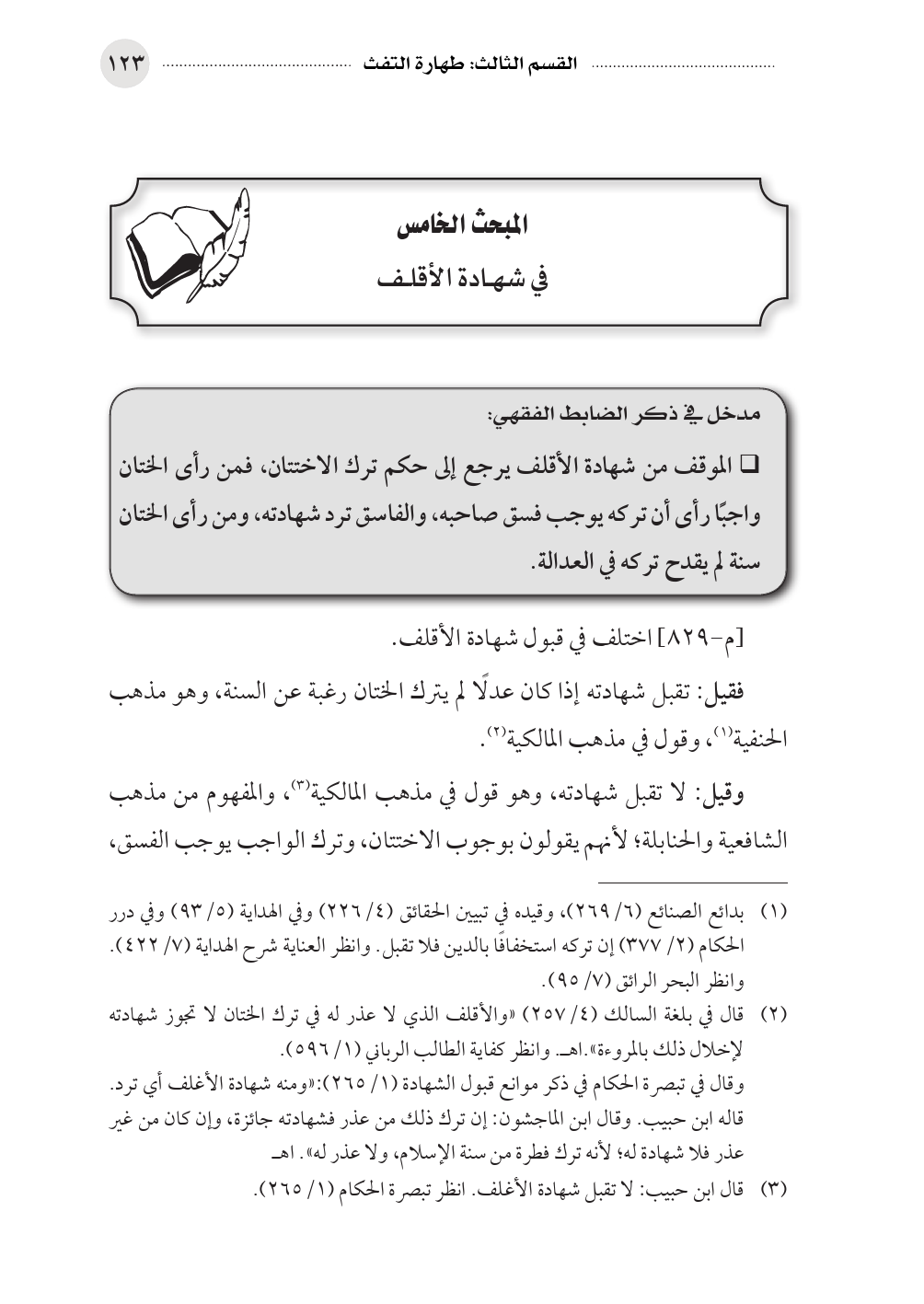 (¬٢) قال في بلغة السالك (٤/ ٢٥٧) «والأقلف الذي لا عذر له في ترك الختان لا تجوز شهادته لإخلال ذلك بالمروءة».اهـ. وانظر كفاية الطالب الرباني (١/ ٥٩٦).