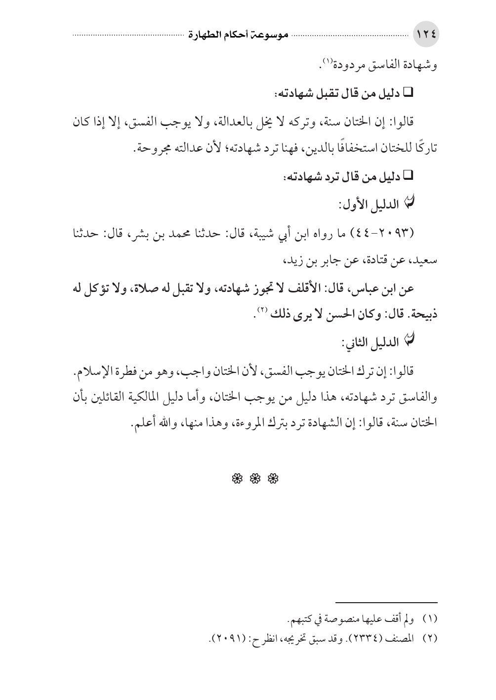 قالوا: إن ترك الختان يوجب الفسق، لأن الختان واجب، وهو من فطرة الإسلام. والفاسق ترد شهادته، هذا دليل من يوجب الختان، وأما دليل المالكية القائلين بأن الختان سنة، قالوا: إن الشهادة ترد بترك المروءة، وهذا منها، والله أعلم.