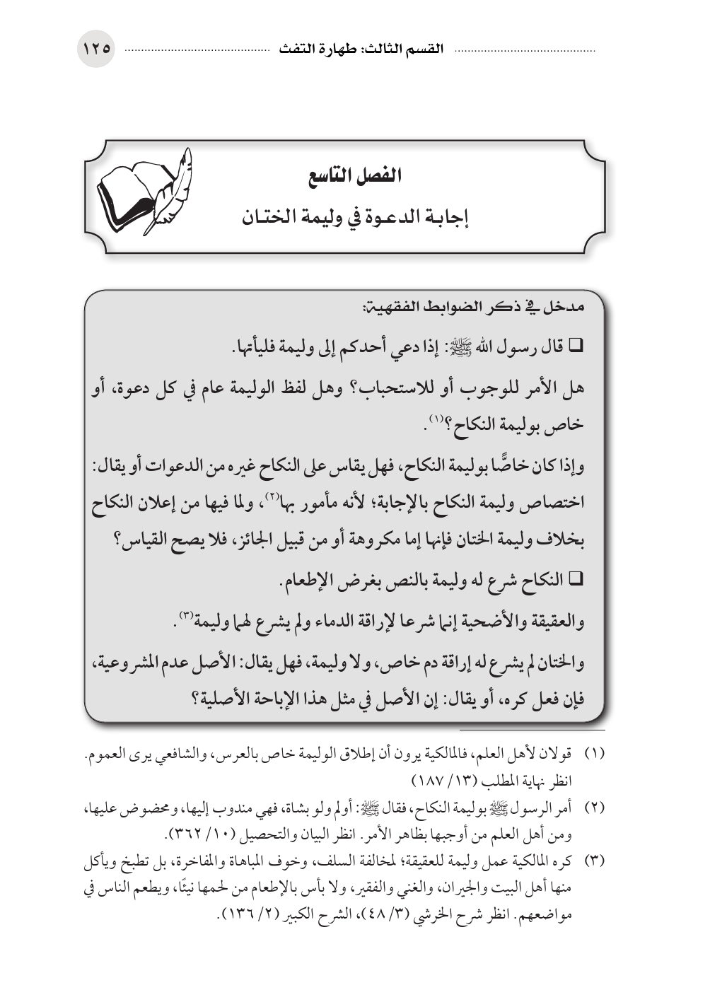 (¬٢) أمر الرسول صلى الله عليه وسلم بوليمة النكاح، فقال صلى الله عليه وسلم: أولم ولو بشاة، فهي مندوب إليها، ومحضوض عليها، ومن أهل العلم من أوجبها بظاهر الأمر. انظر البيان والتحصيل (١٠/ ٣٦٢).