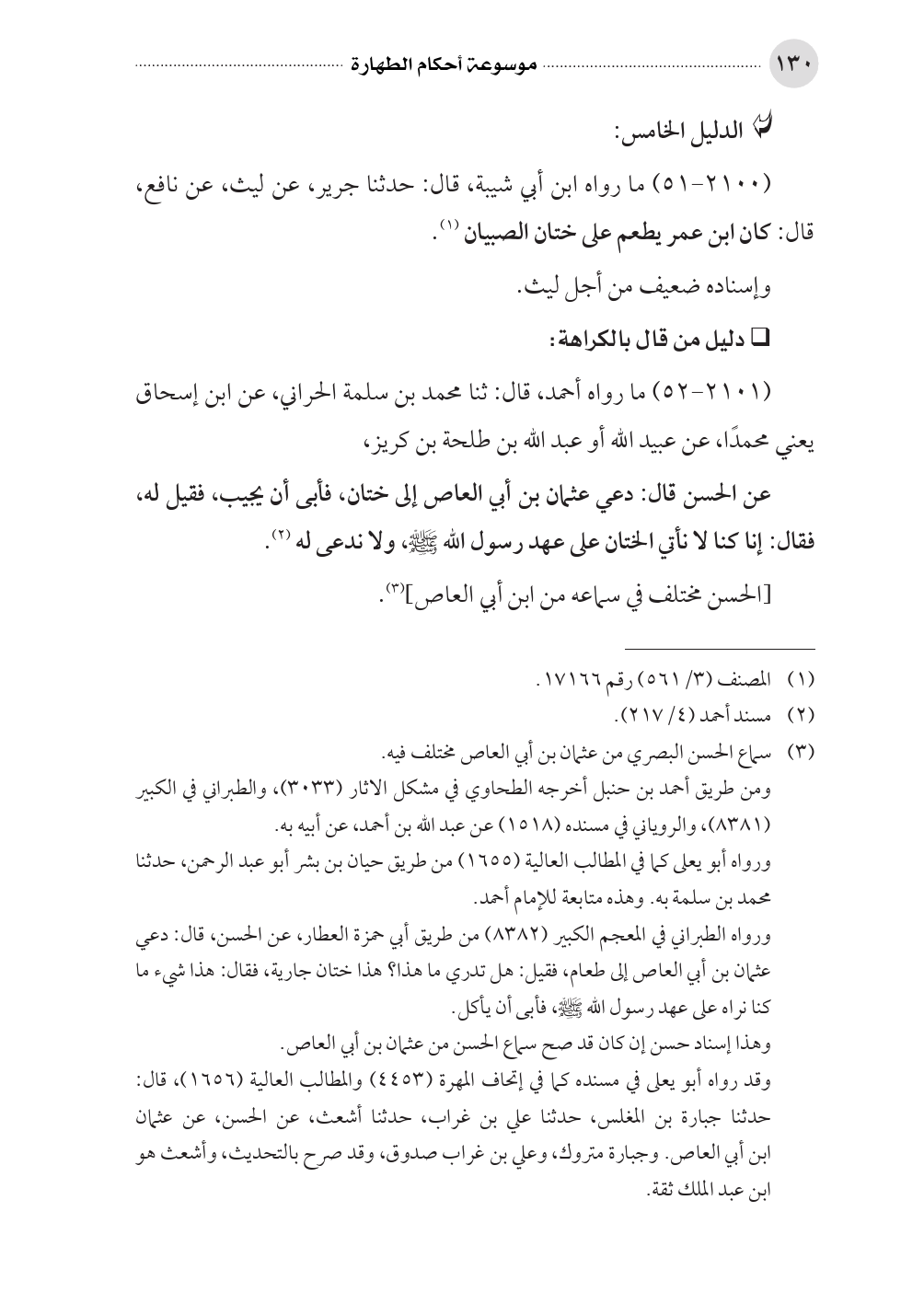 (٢١٠٠ - ٥١) ما رواه ابن أبي شيبة، قال: حدثنا جرير، عن ليث، عن نافع، قال: كان ابن عمر يطعم على ختان الصبيان (¬١).