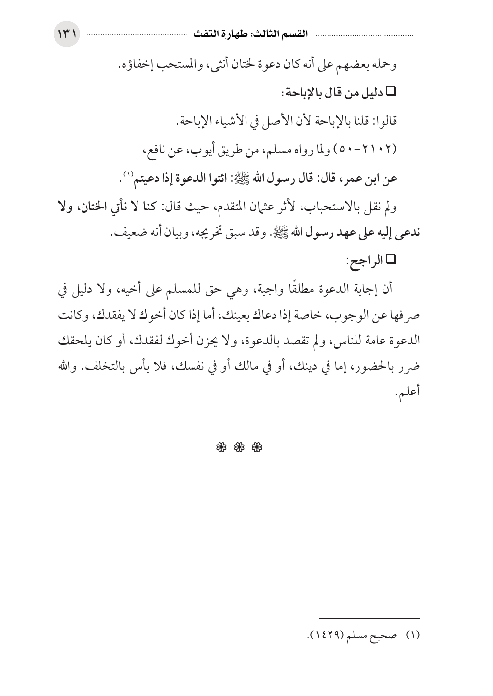 ولم نقل بالاستحباب، لأثر عثمان المتقدم، حيث قال: كنا لا نأتي الختان، ولا ندعى إليه على عهد رسول الله صلى الله عليه وسلم. وقد سبق تخريجه، وبيان أنه ضعيف.