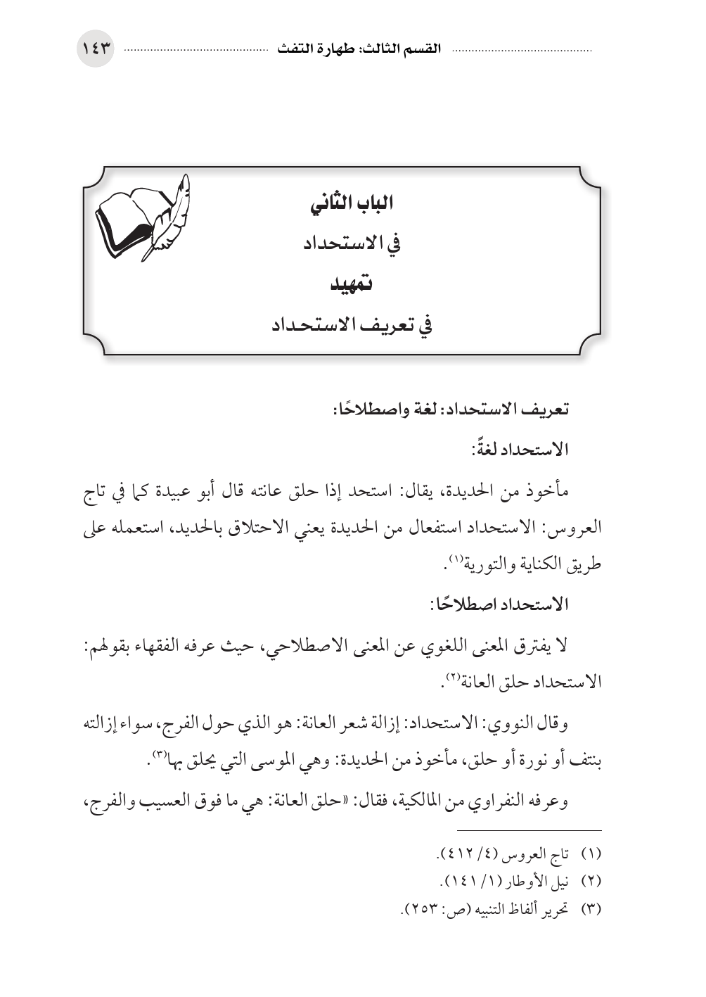 وقال النووي: الاستحداد: إزالة شعر العانة: هو الذي حول الفرج، سواء إزالته بنتف أو نورة أو حلق، مأخوذ من الحديدة: وهي الموسى التي يحلق بها (¬٣).