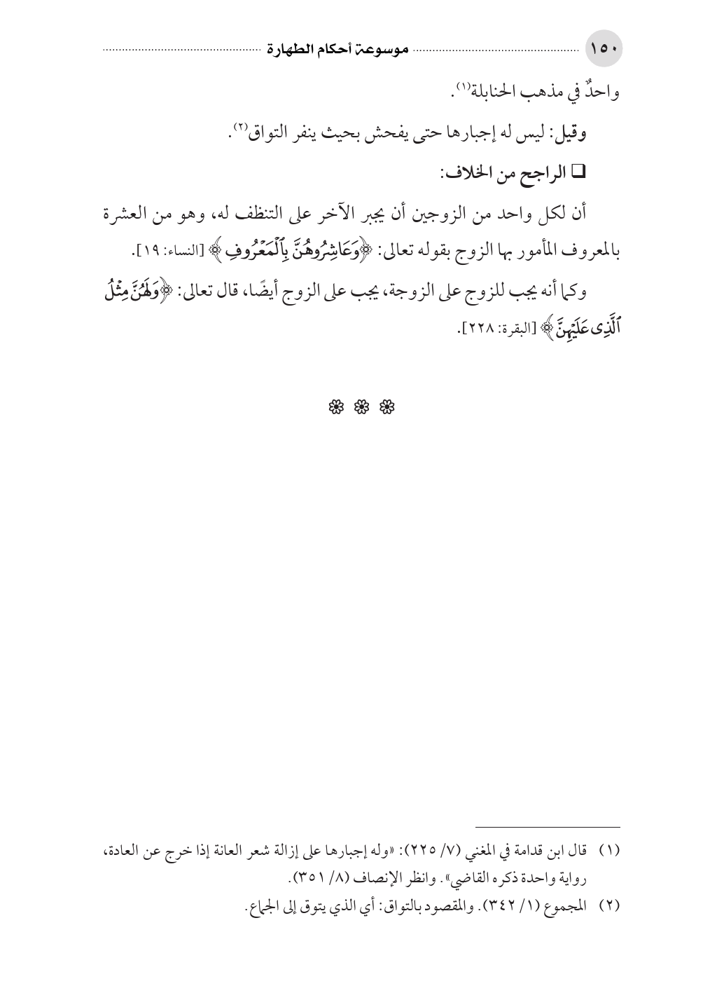 أن لكل واحد من الزوجين أن يجبر الآخر على التنظف له، وهو من العشرة بالمعروف المأمور بها الزوج بقوله تعالى: (وَعَاشِرُوهُنَّ بِالْمَعْرُوفِ) [النساء: ١٩].