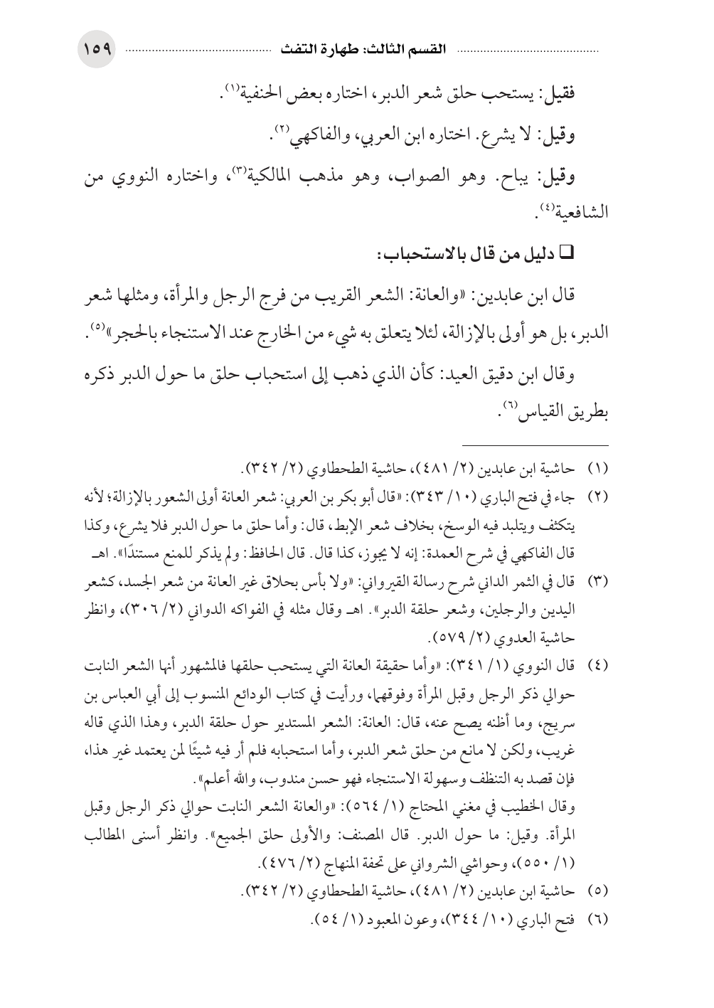 (¬٢) جاء في فتح الباري (١٠/ ٣٤٣): «قال أبو بكر بن العربي: شعر العانة أولى الشعور بالإزالة؛ لأنه يتكثف ويتلبد فيه الوسخ، بخلاف شعر الإبط، قال: وأما حلق ما حول الدبر فلا يشرع، وكذا قال الفاكهي في شرح العمدة: إنه لا يجوز، كذا قال. قال الحافظ: ولم يذكر للمنع مستندًا». اهـ