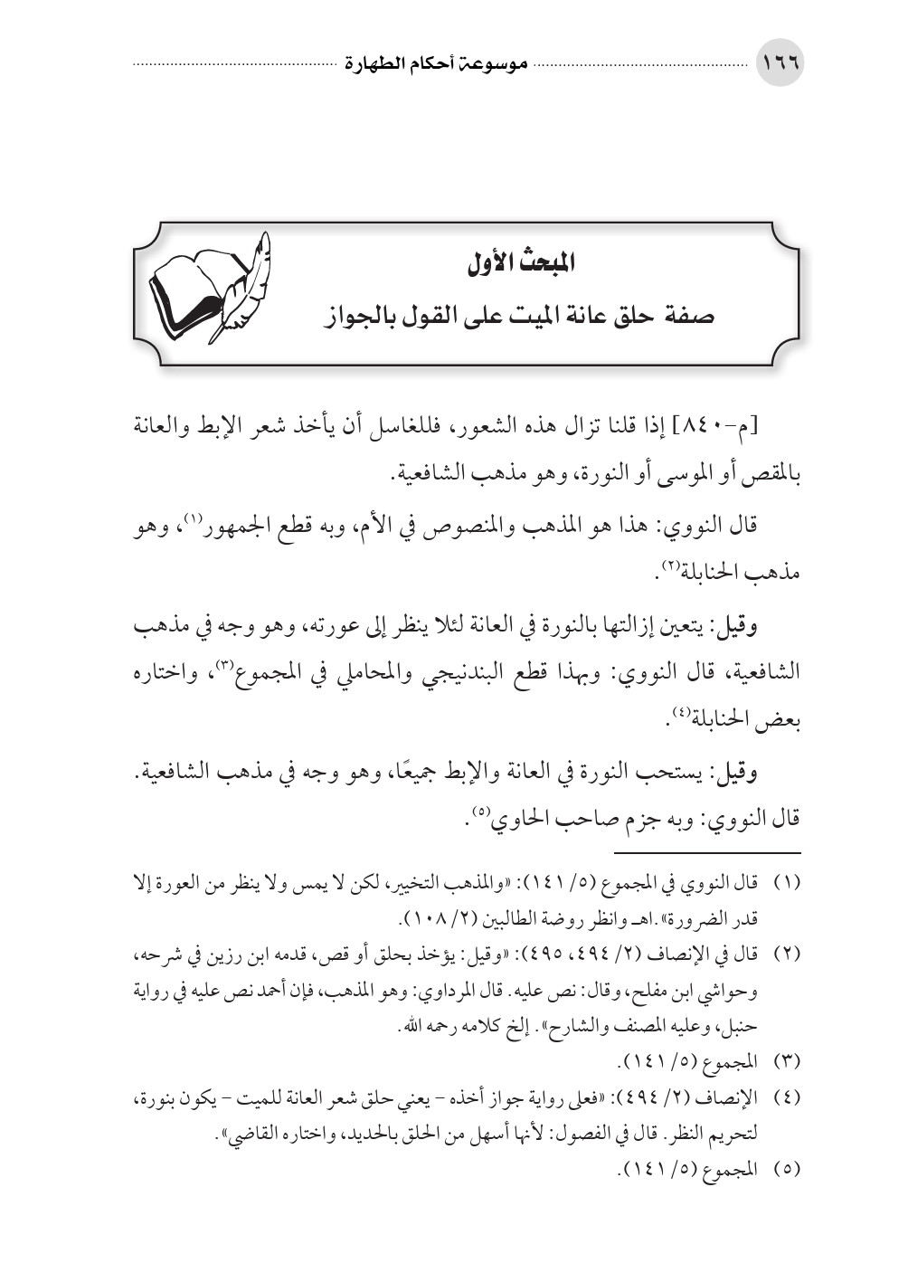 (¬٤) الإنصاف (٢/ ٤٩٤): «فعلى رواية جواز أخذه - يعني حلق شعر العانة للميت - يكون بنورة، لتحريم النظر. قال في الفصول: لأنها أسهل من الحلق بالحديد، واختاره القاضي».