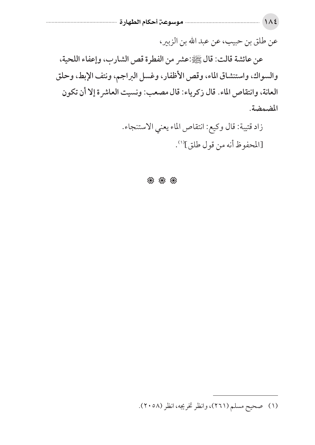 عن عائشة قالت: قال صلى الله عليه وسلم: عشر من الفطرة قص الشارب، وإعفاء اللحية، والسواك، واستنشاق الماء، وقص الأظفار، وغسل البراجم، ونتف الإبط، وحلق العانة، وانتقاص الماء. قال زكرياء: قال مصعب: ونسيت العاشرة إلا أن تكون المضمضة.