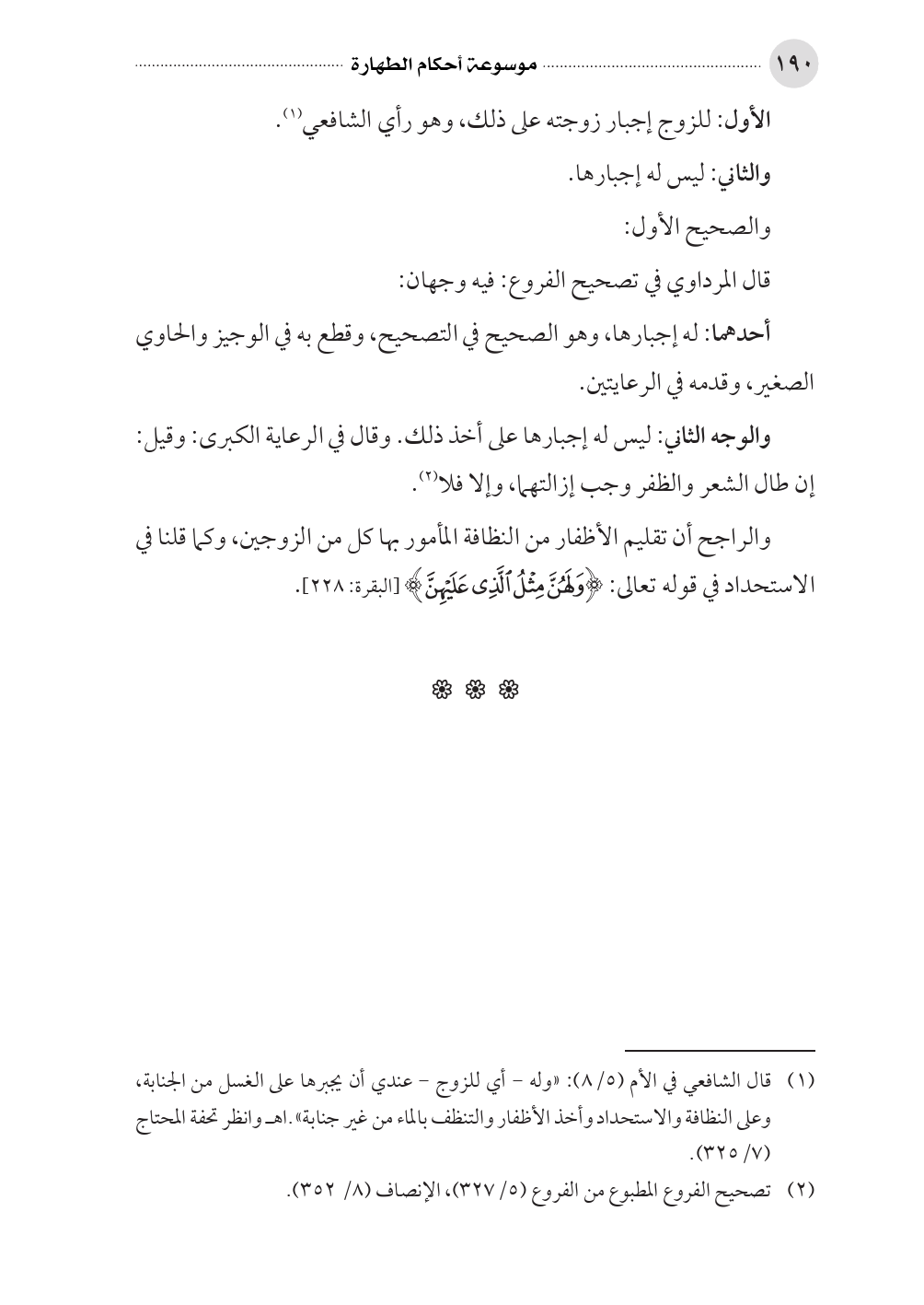 (¬١) قال الشافعي في الأم (٥/ ٨): «وله - أي للزوج - عندي أن يجبرها على الغسل من الجنابة، وعلى النظافة والاستحداد وأخذ الأظفار والتنظف بالماء من غير جنابة».اهـ وانظر تحفة المحتاج (٧/ ٣٢٥).
