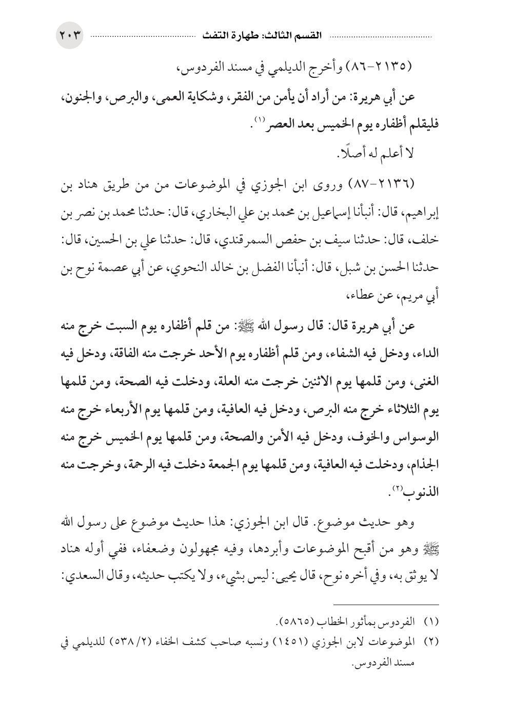 عن أبي هريرة قال: قال رسول الله صلى الله عليه وسلم: من قلم أظفاره يوم السبت خرج منه الداء، ودخل فيه الشفاء، ومن قلم أظفاره يوم الأحد خرجت منه الفاقة، ودخل فيه الغنى، ومن قلمها يوم الاثنين خرجت منه العلة، ودخلت فيه الصحة، ومن قلمها يوم الثلاثاء خرج منه البرص، ودخل فيه العافية، ومن قلمها يوم الأربعاء خرج منه الوسواس والخوف، ودخل فيه الأمن والصحة، ومن قلمها يوم الخميس خرج منه الجذام، ودخلت فيه العافية، ومن قلمها يوم الجمعة دخلت فيه الرحمة، وخرجت منه الذنوب (¬٢).