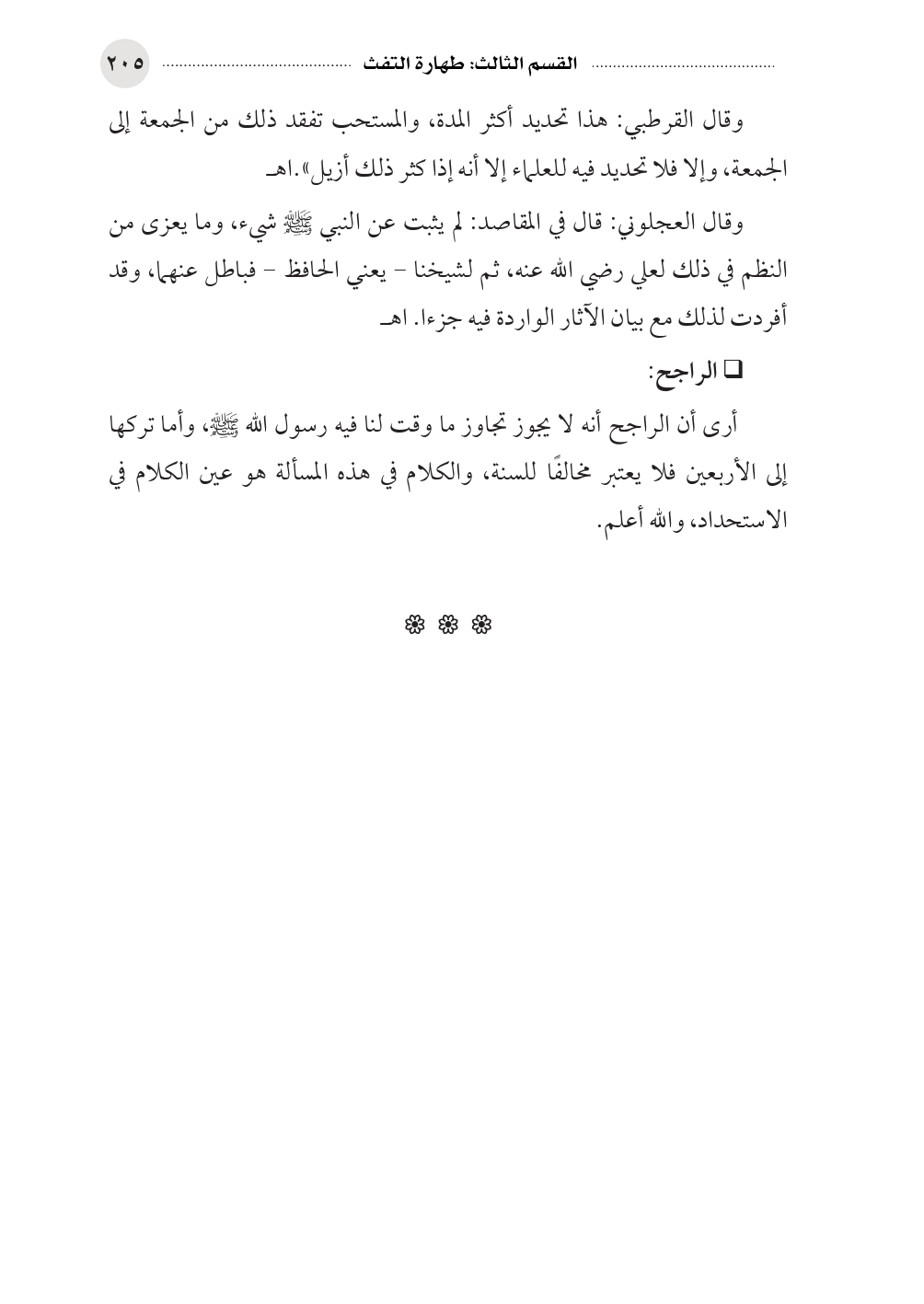 وقال القرطبي: هذا تحديد أكثر المدة، والمستحب تفقد ذلك من الجمعة إلى الجمعة، وإلا فلا تحديد فيه للعلماء إلا أنه إذا كثر ذلك أزيل».اهـ