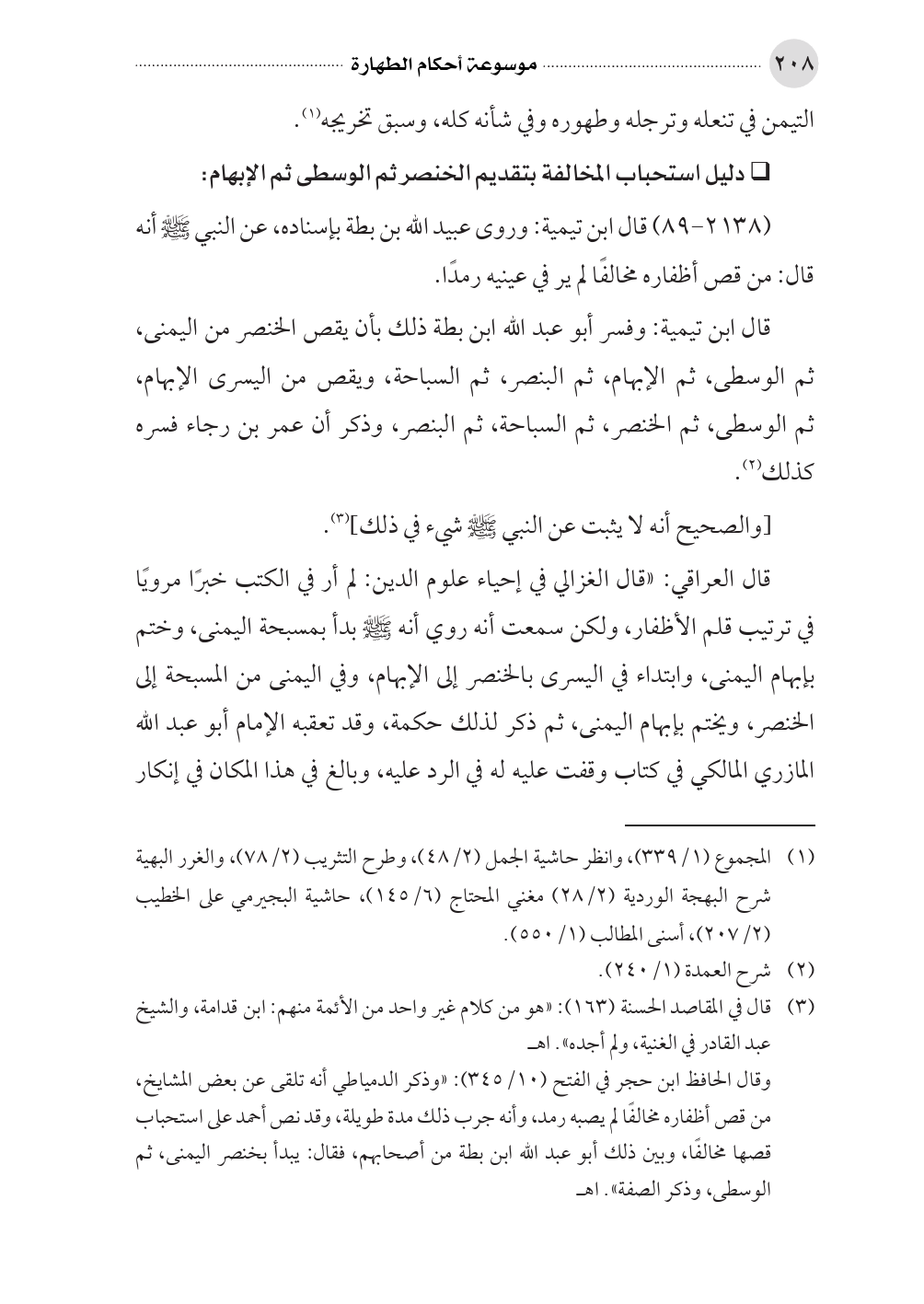 قال العراقي: «قال الغزالي في إحياء علوم الدين: لم أر في الكتب خبرًا مرويًا في ترتيب قلم الأظفار، ولكن سمعت أنه روي أنه صلى الله عليه وسلم بدأ بمسبحة اليمنى، وختم بإبهام اليمنى، وابتداء في اليسرى بالخنصر إلى الإبهام، وفي اليمنى من المسبحة إلى الخنصر، ويختم بإبهام اليمنى، ثم ذكر لذلك حكمة، وقد تعقبه الإمام أبو عبد الله المازري المالكي في كتاب وقفت عليه له في الرد عليه، وبالغ في هذا المكان في إنكار