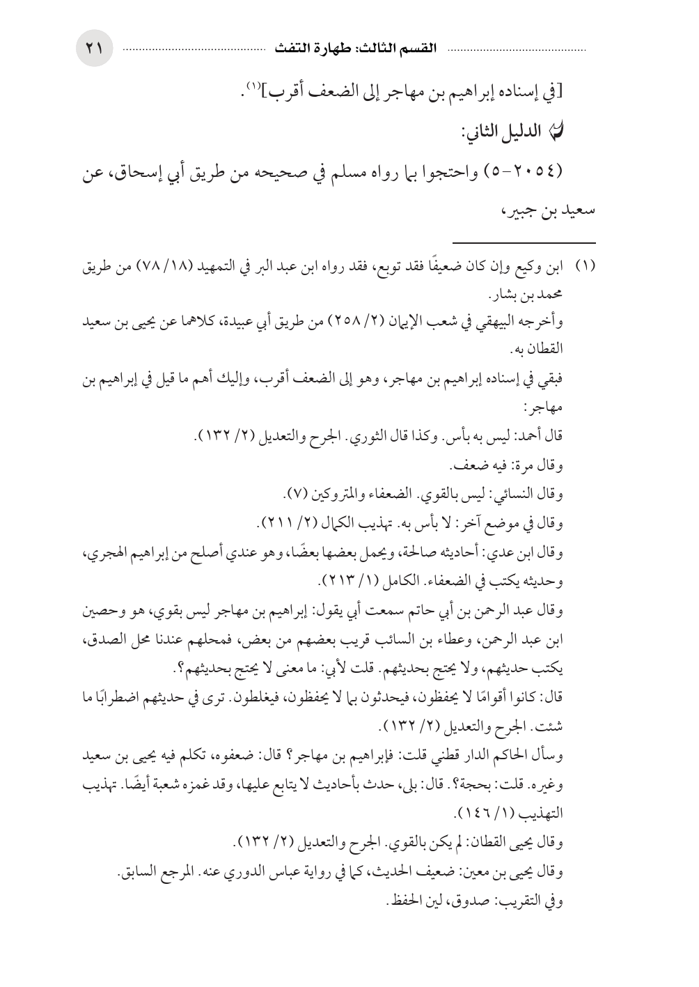 فبقي في إسناده إبراهيم بن مهاجر، وهو إلى الضعف أقرب، وإليك أهم ما قيل في إبراهيم بن مهاجر: