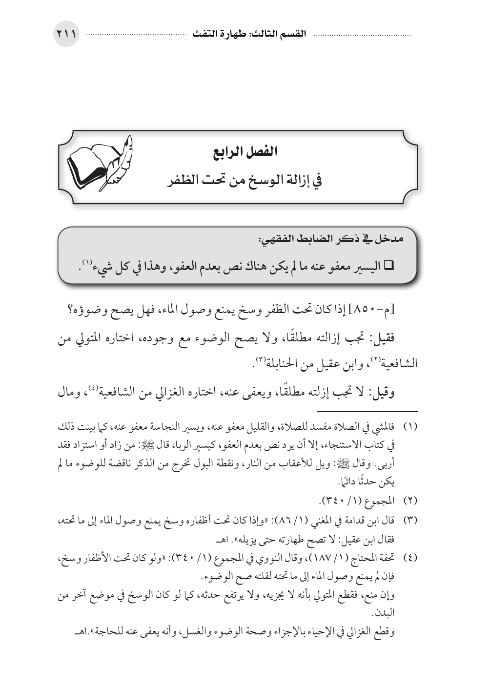 (¬٣) قال ابن قدامة في المغني (١/ ٨٦): «وإذا كان تحت أظفاره وسخ يمنع وصول الماء إلى ما تحته، فقال ابن عقيل: لا تصح طهارته حتى يزيله». اهـ