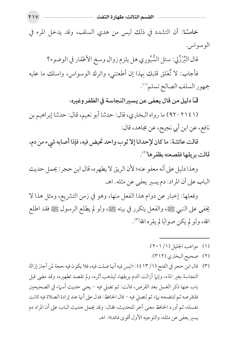 (¬٣) قال ابن حجر في الفتح (١/ ٤١٣): «ليس فيه أنها صلت فيه، فلا يكون فيه حجة لمن أجاز إزالة النجاسة بغير الماء، وإنما أزالت الدم بريقها، ليذهب أثره، ولم تقصد تطهيره، وقد مضى قبل باب عنها ذكر الغسل بعد القرص، قالت: ثم تصلي فيه - يعني حديث أسماء في الصحيحين فلتقرصه ثم لتنضحه بماء ثم لتصلي فيه - قال الحافظ: فدل على أنها عند إرادة الصلاة فيه كانت تغسله، ثم أورد الحافظ معنى آخر للحديث، فقال: وقد يحمل حديث الباب على أن المراد دم يسير يعفى عن مثله، والتوجيه الأول أقوى فائدة». اهـ