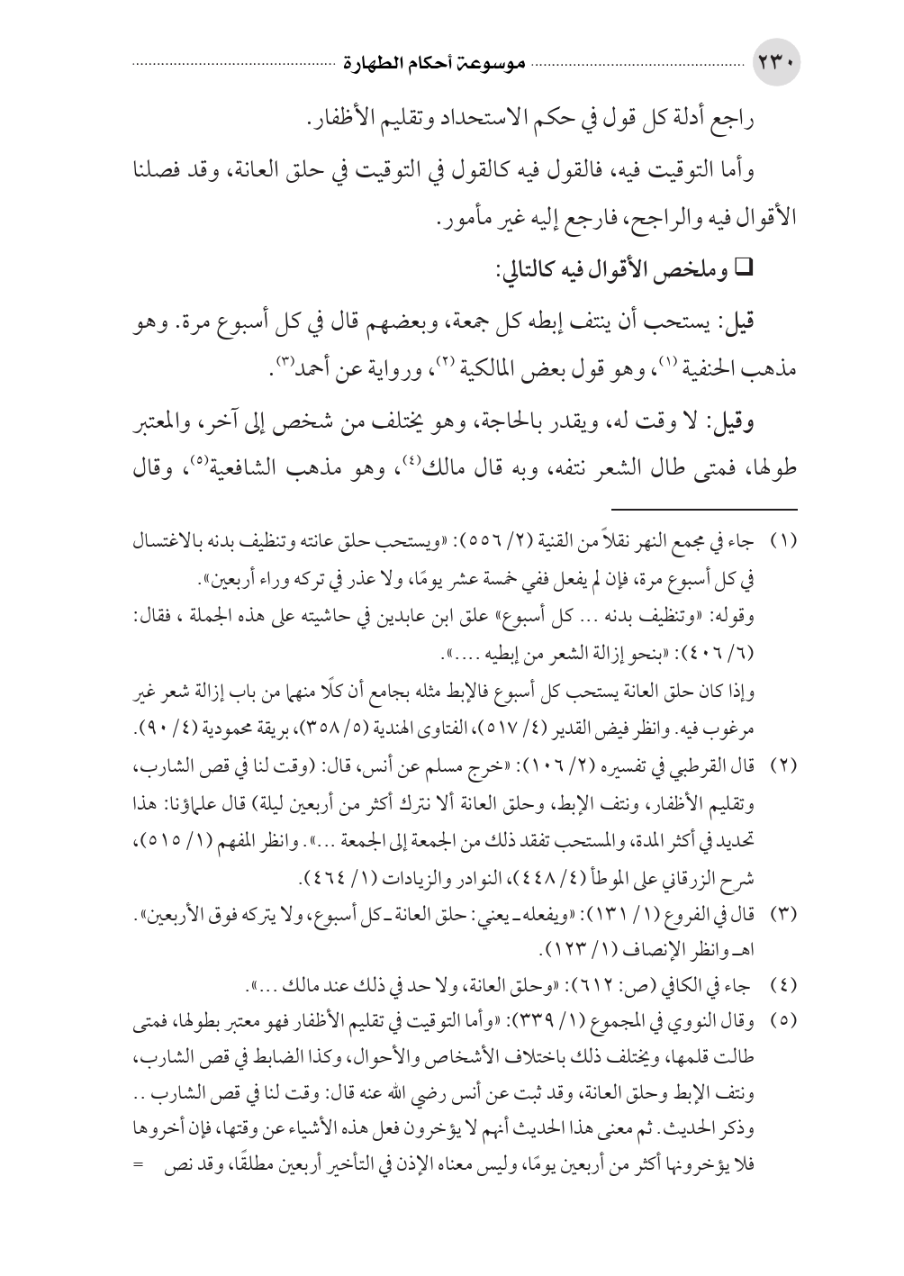 (¬٣) قال في الفروع (١/ ١٣١): «ويفعله ـ يعني: حلق العانة ـ كل أسبوع، ولا يتركه فوق الأربعين». اهـ وانظر الإنصاف (١/ ١٢٣).
