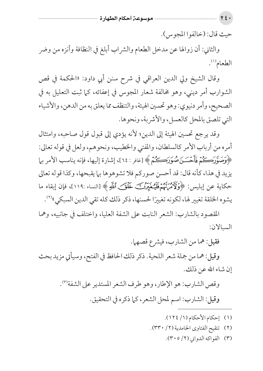 وقد يرجع تحسين الهيئة إلى الدين؛ لأنه يؤدي إلى قبول قول صاحبه، وامتثال أمره من أرباب الأمر كالسلطان، والمفتي والخطيب، ونحوهم، ولعل في قوله تعالى: (وَصَوَّرَكُمْ فَأَحْسَنَ صُوَرَكُمْ) [غافر: ٦٤]، إشارة إليها، فإنه يناسب الأمر بما يزيد في هذا، كأنه قال: قد أحسن صوركم فلا تشوهوها بما يقبحها، وكذا قوله تعالى حكاية عن إبليس: (وَلآمُرَنَّهُمْ فَلَيُغَيِّرُنَّ خَلْقَ اللَّهِ) [النساء: ١١٩]، فإن إبقاء ما يشوه الخلقة تغيير لها، لكونه تغييرًا لحسنها، ذكر ذلك كله تقي الدين السبكي» (¬٢).
