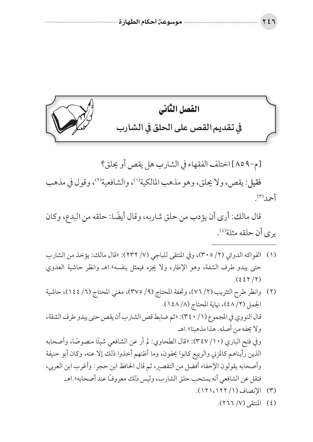 (¬١) الفواكه الدواني (٢/ ٣٠٥)، وفي المنتقى للباجي (٧/ ٢٣٢): «قال مالك: يؤخذ من الشارب حتى يبدو طرف الشفة، وهو الإطار، ولا يجزه فيمثل بنفسه».اهـ وانظر حاشية العدوي (٢/ ٤٤٢).