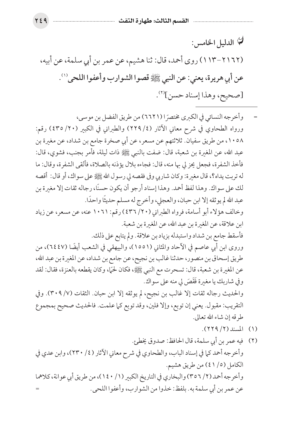 وأخرجه أحمد (٢/ ٣٥٦) والبخاري في التاريخ الكبير (١/ ١٤٠)، من طريق أبي عوانة، كلاهما عن عمر بن أبي سلمة به. بلفظ: خذوا من الشوارب، وأعفوا اللحى. ...