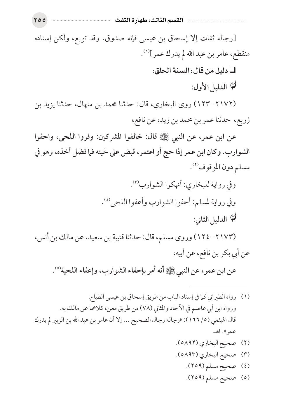 عن ابن عمر، عن النبي صلى الله عليه وسلم قال: خالفوا المشركين: وفروا اللحى، واحفوا الشوارب. وكان ابن عمر إذا حج أو اعتمر، قبض على لحيته فما فضل أخذه، وهو في مسلم دون الموقوف (¬٢).