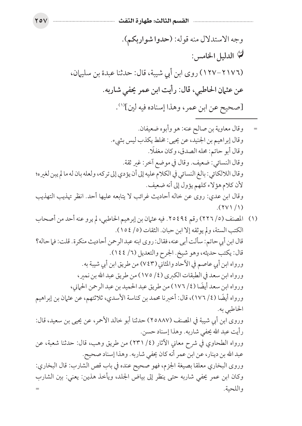 (¬١) المصنف (٥/ ٢٢٦) رقم ٢٥٤٩٤. فيه عثمان بن إبرهيم الحاطبي، لم يرو عنه أحد من أصحاب الكتب الستة، ولم يوثقه إلا ابن حبان. الثقات (٥/ ١٥٤).