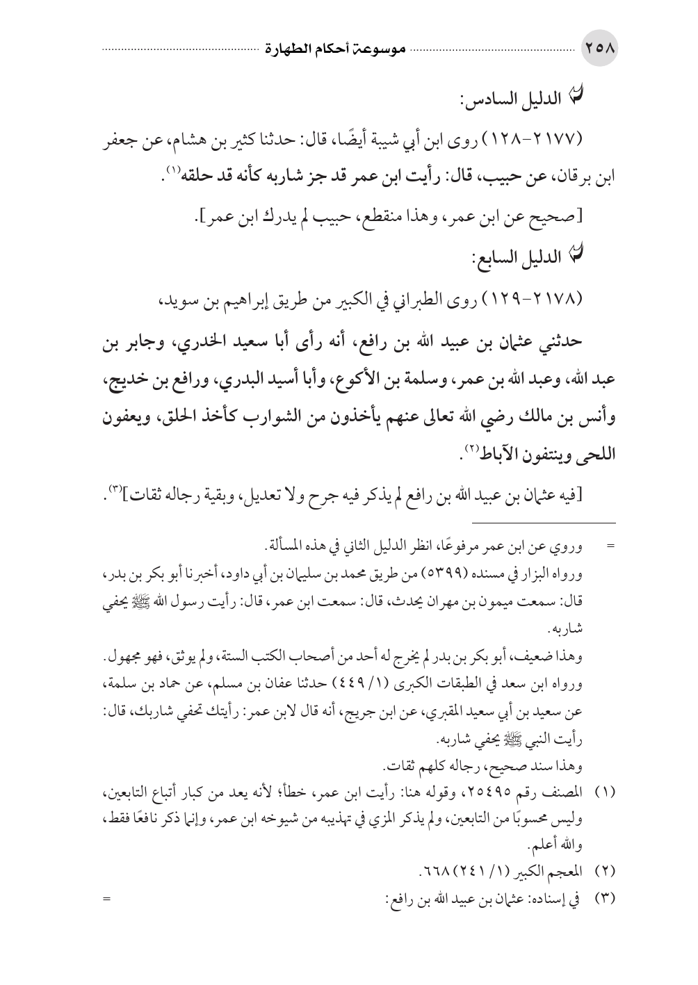 (٢١٧٧ - ١٢٨) روى ابن أبي شيبة أيضًا، قال: حدثنا كثير بن هشام، عن جعفر ابن برقان، عن حبيب، قال: رأيت ابن عمر قد جز شاربه كأنه قد حلقه (¬١).