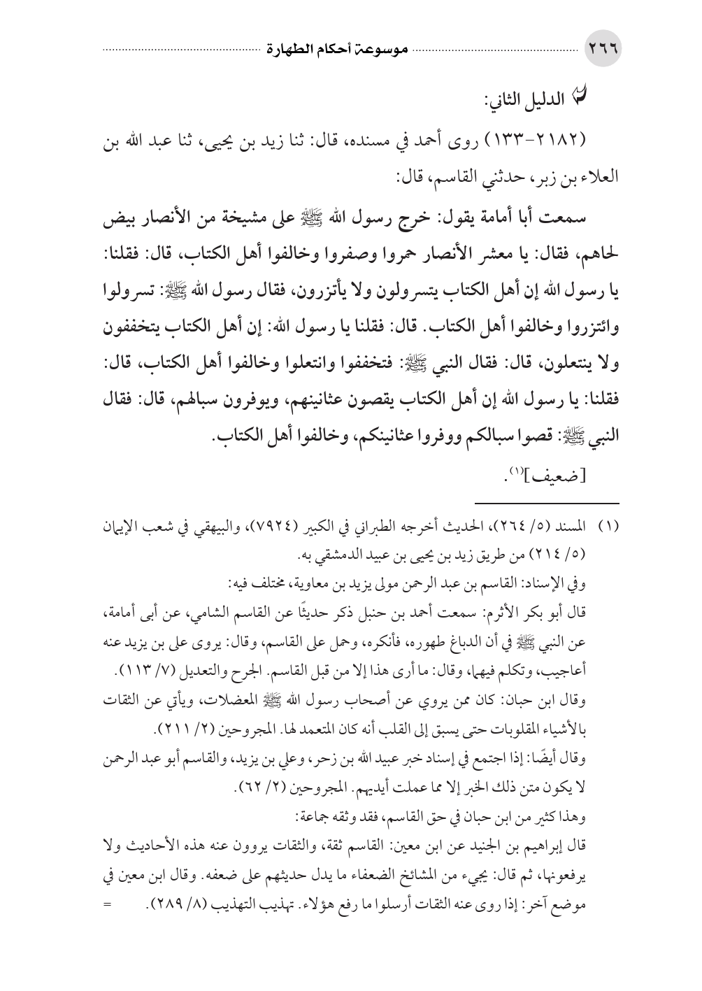 (٢١٨٢ - ١٣٣) روى أحمد في مسنده، قال: ثنا زيد بن يحيى، ثنا عبد الله بن العلاء بن زبر، حدثني القاسم، قال: